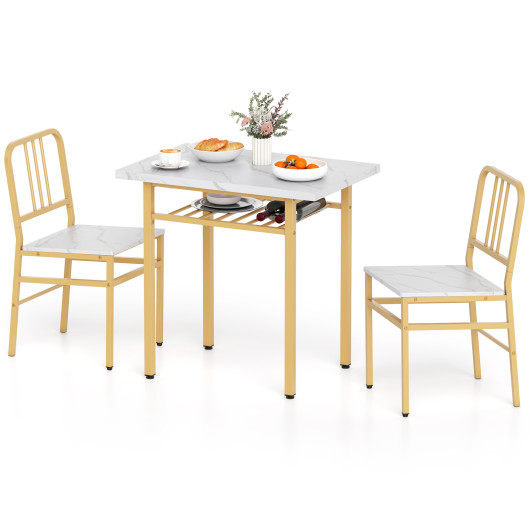● 3 piece dining table set is suitable for intimate gathering or chatting● The dining chairs can be tucked under the table when not in use● Open storage shelf can keep essentials within easy reach● Ergonomic backrest promotes comfortable sitting experience● Dining chairs with robust met