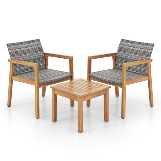 ● Solid acacia wood with exquisite craft for reliability● Hand-woven PE rattan is colorfast and sun-protective● Convenient coffee table for easy access to items● Slatted tabletop to avoid water accumulation● Thoughtful armrests and backrest for comfort● Reinforced connections to ensur