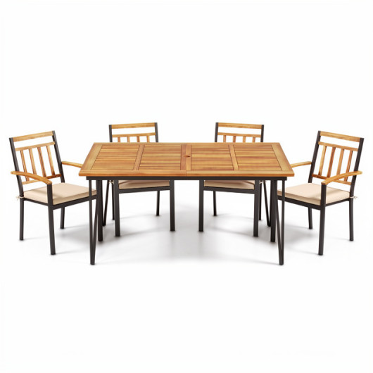 ● Acacia wood tabletop, natural texture and stylish appearance● 63″ x 37.5″ spacious tabletop, seats up to 6 people● Center umbrella hole design, patio umbrella compatible (not included)● Waterproof painted surface and slatted design for easy cleaning and quick drying● Heavy