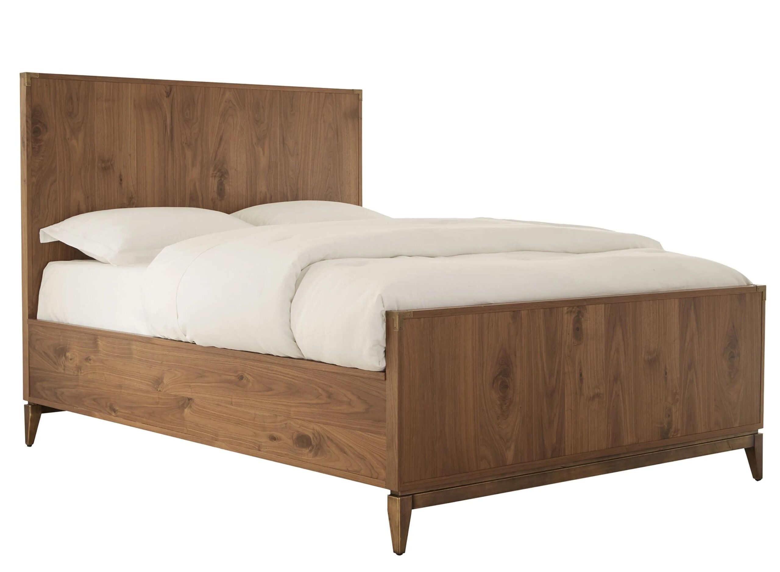 With a simple yet sophisticated profile, Adler Full Panel Bed is built from Walnut veneers in a knotty walnut finish. Bronzed brass campaign-style corner brackets and tapered metal legs provide a subtle contrast to the warm tones of the timber for a look that is both fresh and timeless.