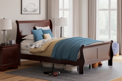 This full sleigh bed is the epitome of traditional decor. Its Louis Philippe-style moulding dates back to the mid-19th century, when furnishings were lavish yet somewhat simple. A deep finish brings warmth and elegance into the space.