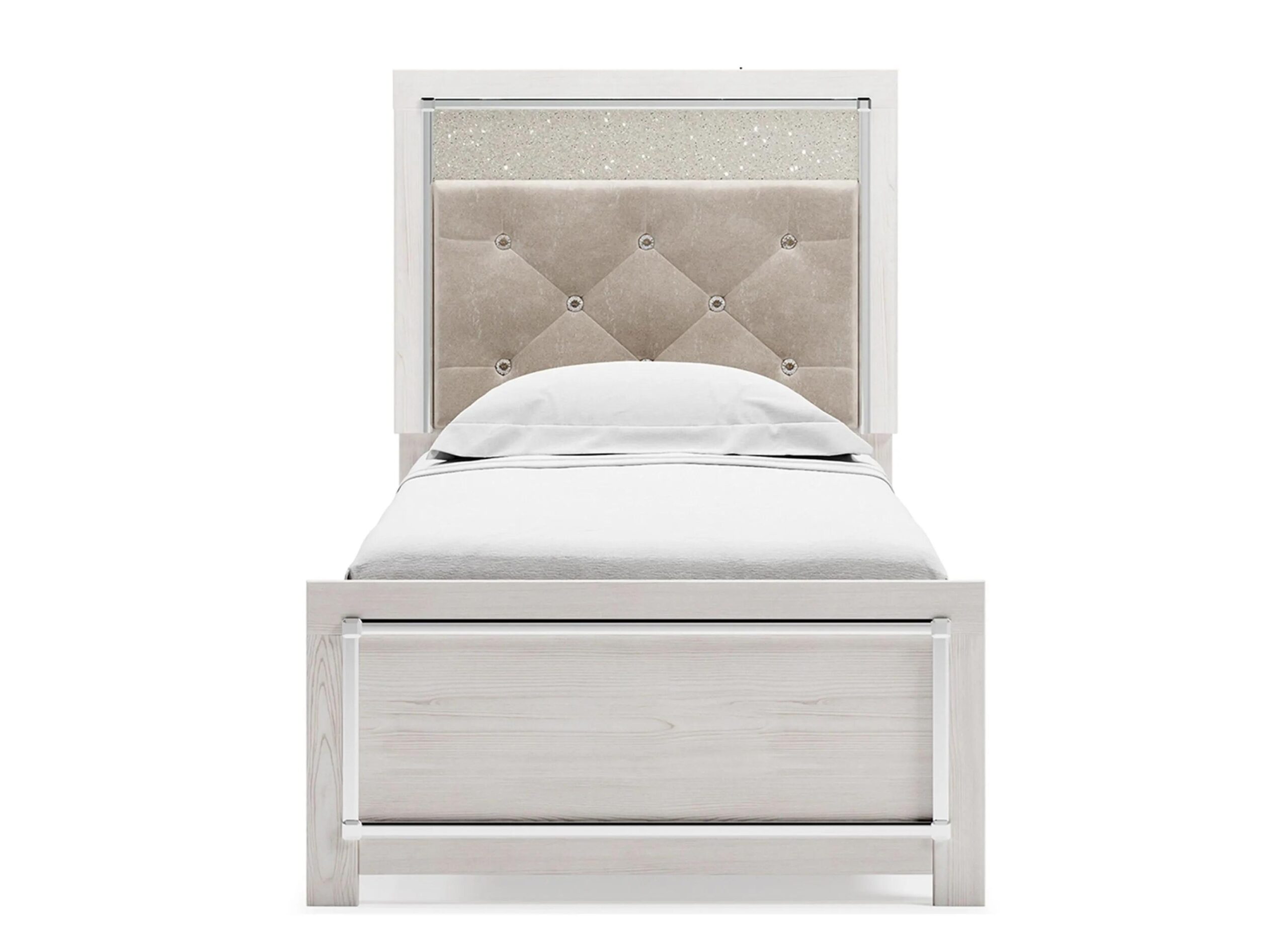 Altyra Twin Panel Bed is a beautiful blend of comfort and luxury. Shiny chrome-tone accents, a pearlized finish and button-tufted upholstery bring a glam touch to the richly rustic appearance. Remote-controlled LED lighting adds style and modern conveniences to your restful retreat.