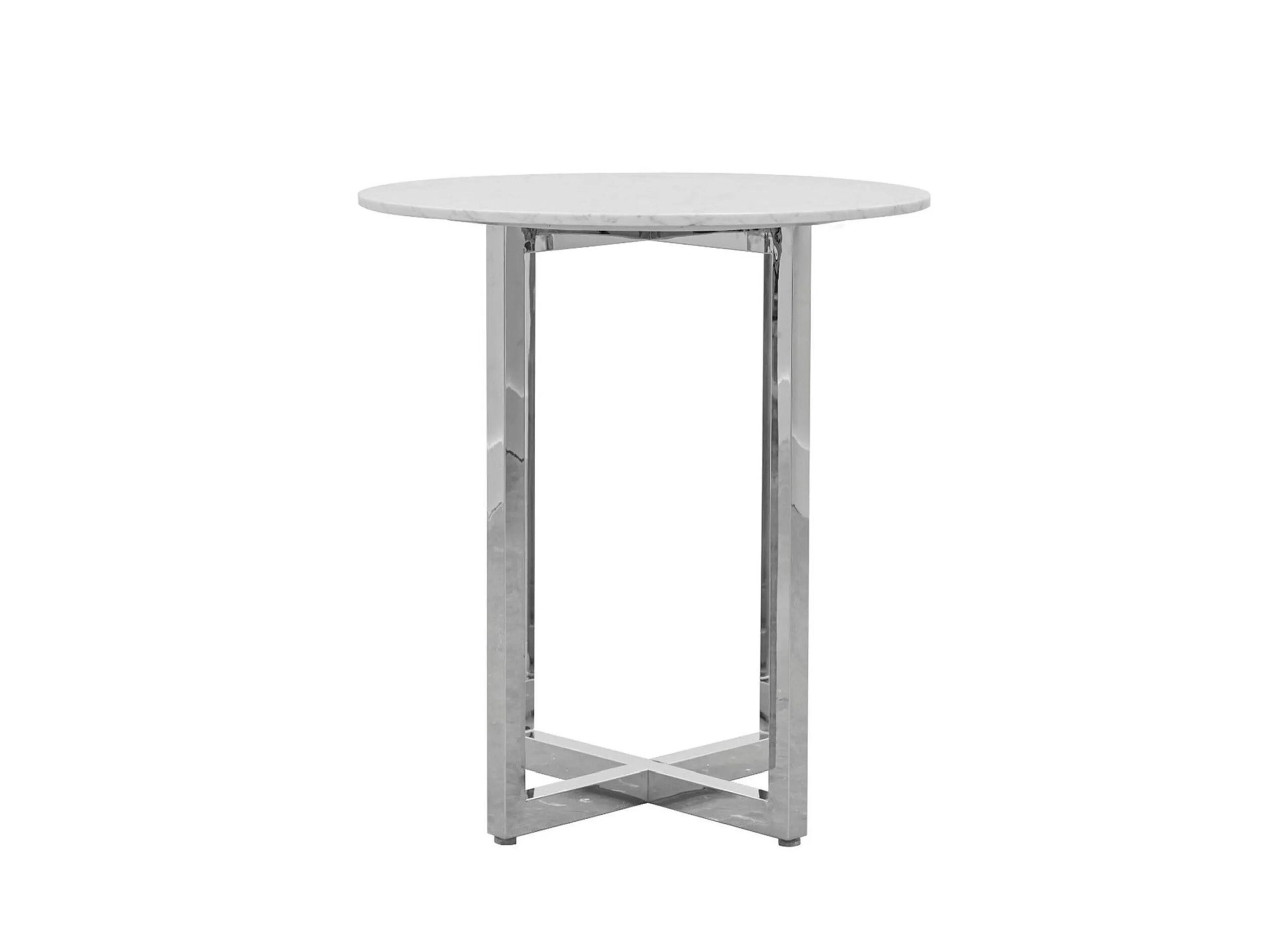 Exceptional from top to bottom, the Amalfi Marble Bar Height Dining Table features traces of natural veining, ensuring each piece is unique. One-piece metal base is hand-cut and welded from tubular stainless steel for durability and chrome-plated for a mirror finish.