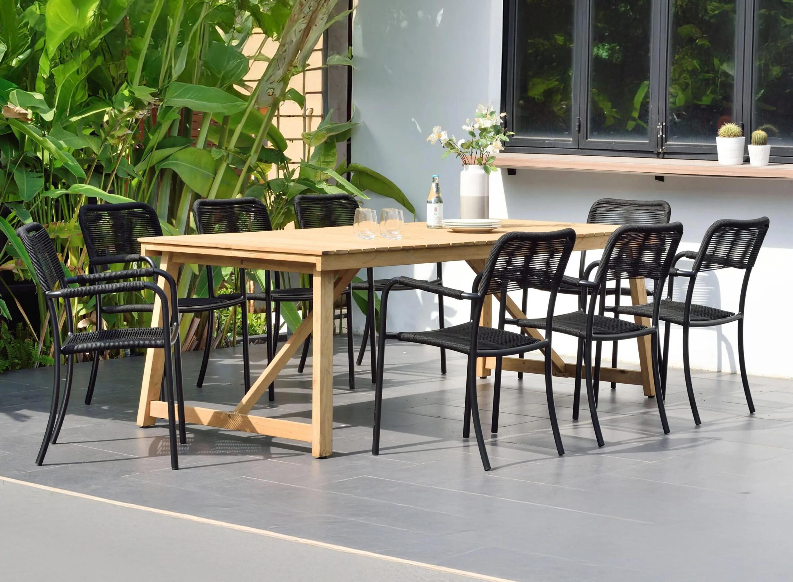 Amazonia outdoor 9-pc. rectangular patio dining table set with armchairs focuses on contemporary and modern design, comfort, and maintaining the durability of each piece. This patio set is crafted to enhance your outdoor areas with modern lines and colors.