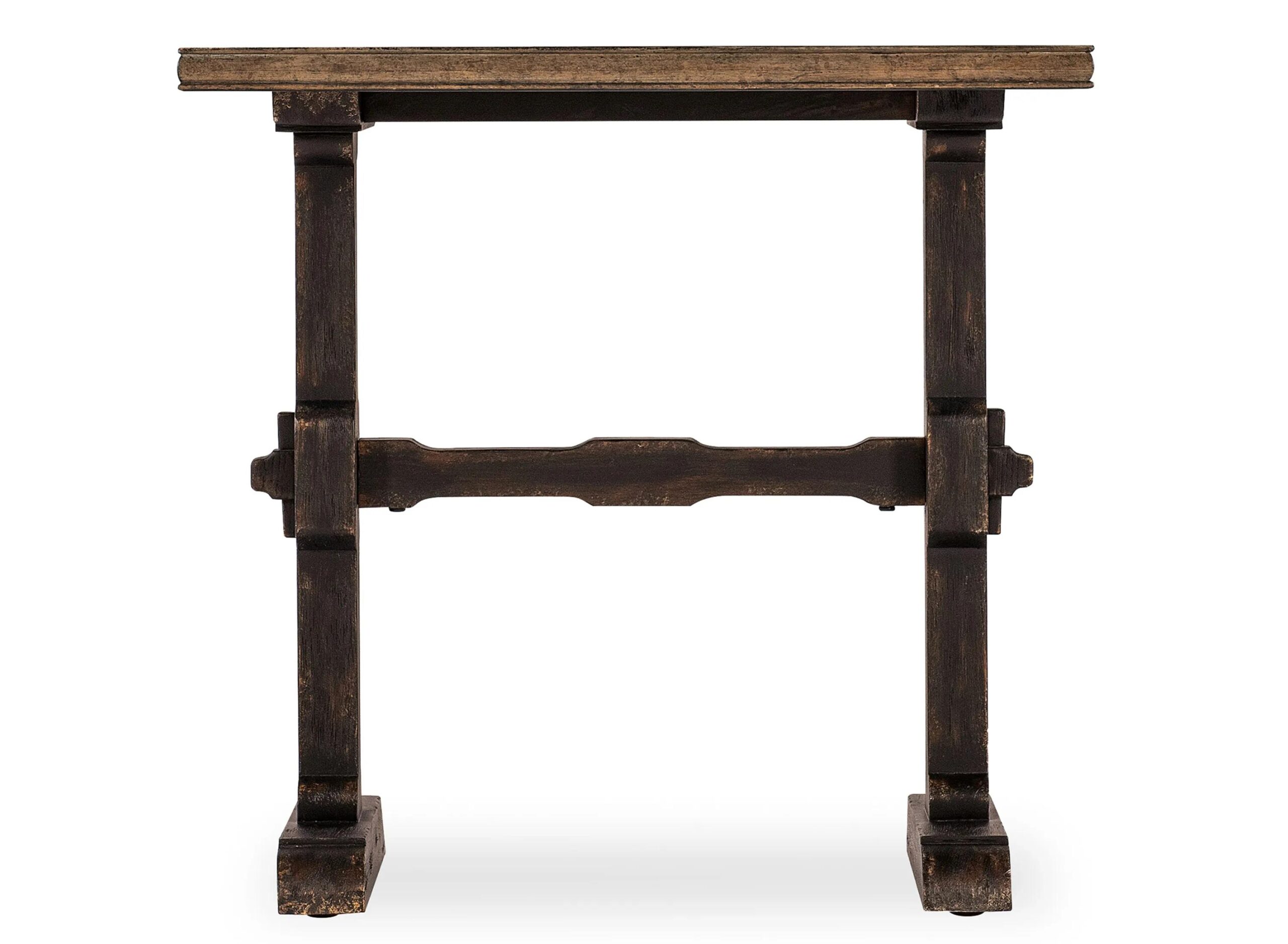 Americana Trestle End Table has a two-tone finish combining a parquet Oak Veneer top design with a Molasses finish on the base. Capturing the essence of a well-loved heirloom, the deep dark Molasses tone over Cathedral Oak Veneers adds warmth, while the variations in color reveal the natural beau