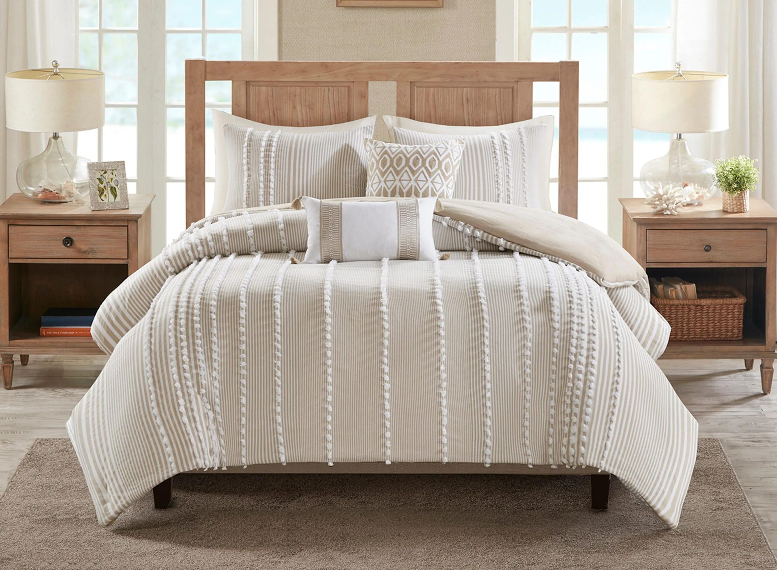 Update your bedroom with the casual beauty of the Anslee king 3-piece comforter set. Oversized and overfilled, this cotton yarn dyed comforter showcases stripes of various widths in soft taupe and white hues.