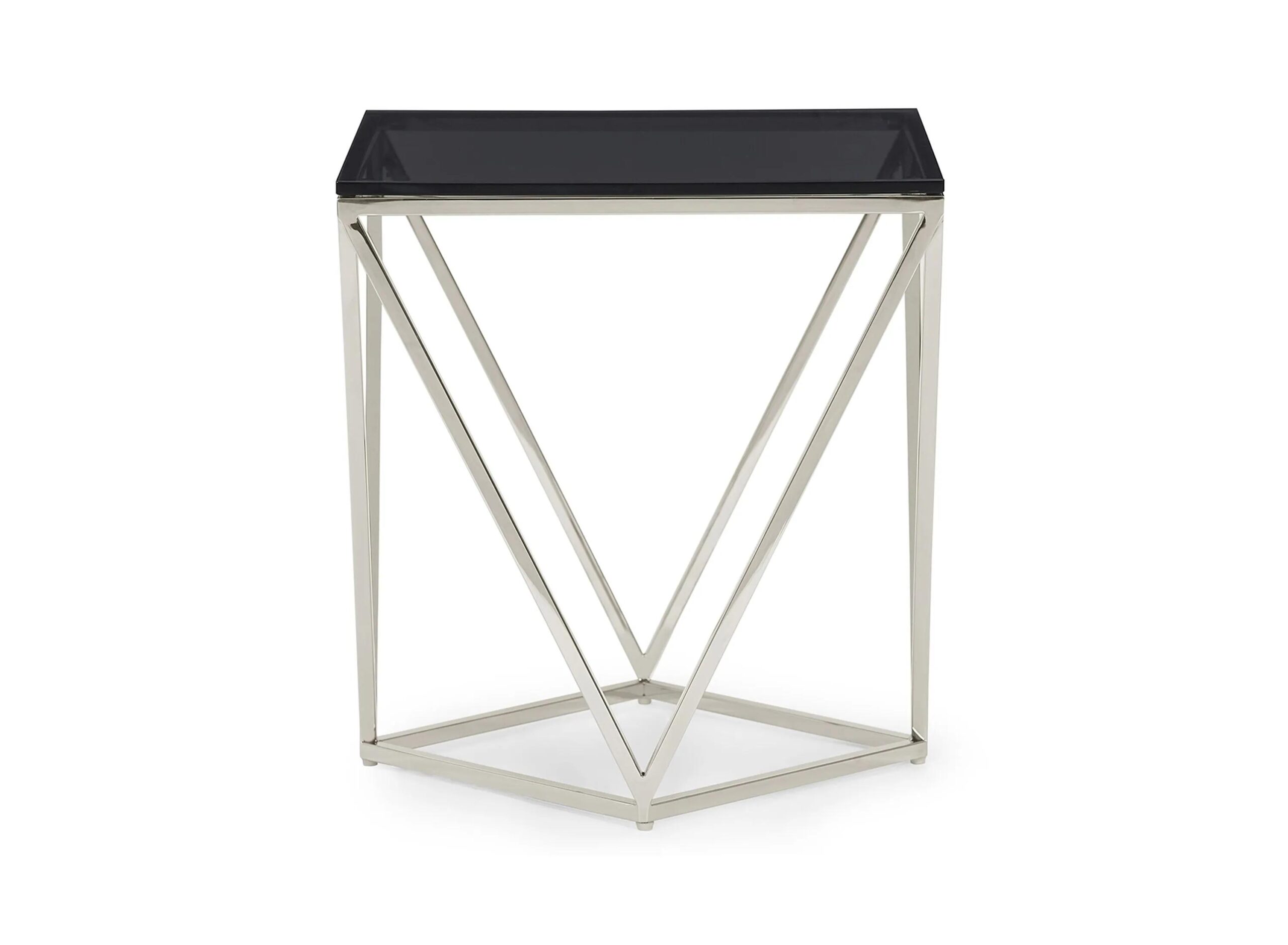Modernize your space with the Aria End Table. The Aria End Table offset squares are joined at the corners in a simple but striking geometric arrangement. The faceted formation is accented with polished stainless steel and smoked glass to achieve a wholly modern and glamorous aesthetic.