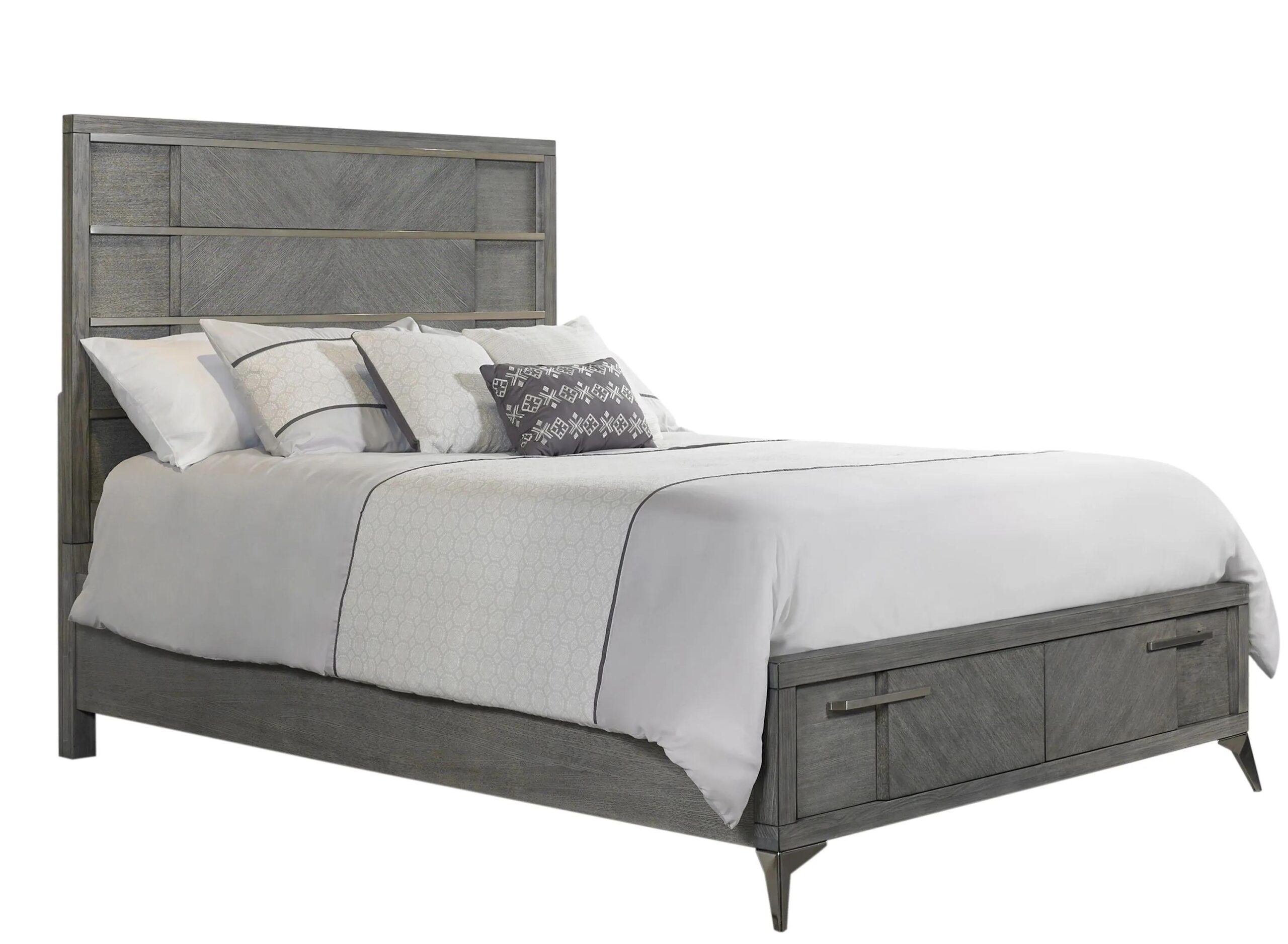 Aries Queen Storage Bed is a stylish and modern bed that features book matched veneers, custom nickel hardware, and built-in storage drawers. The veneer used in the bed is made from high-quality ash, which gives it a beautiful natural grain pattern.