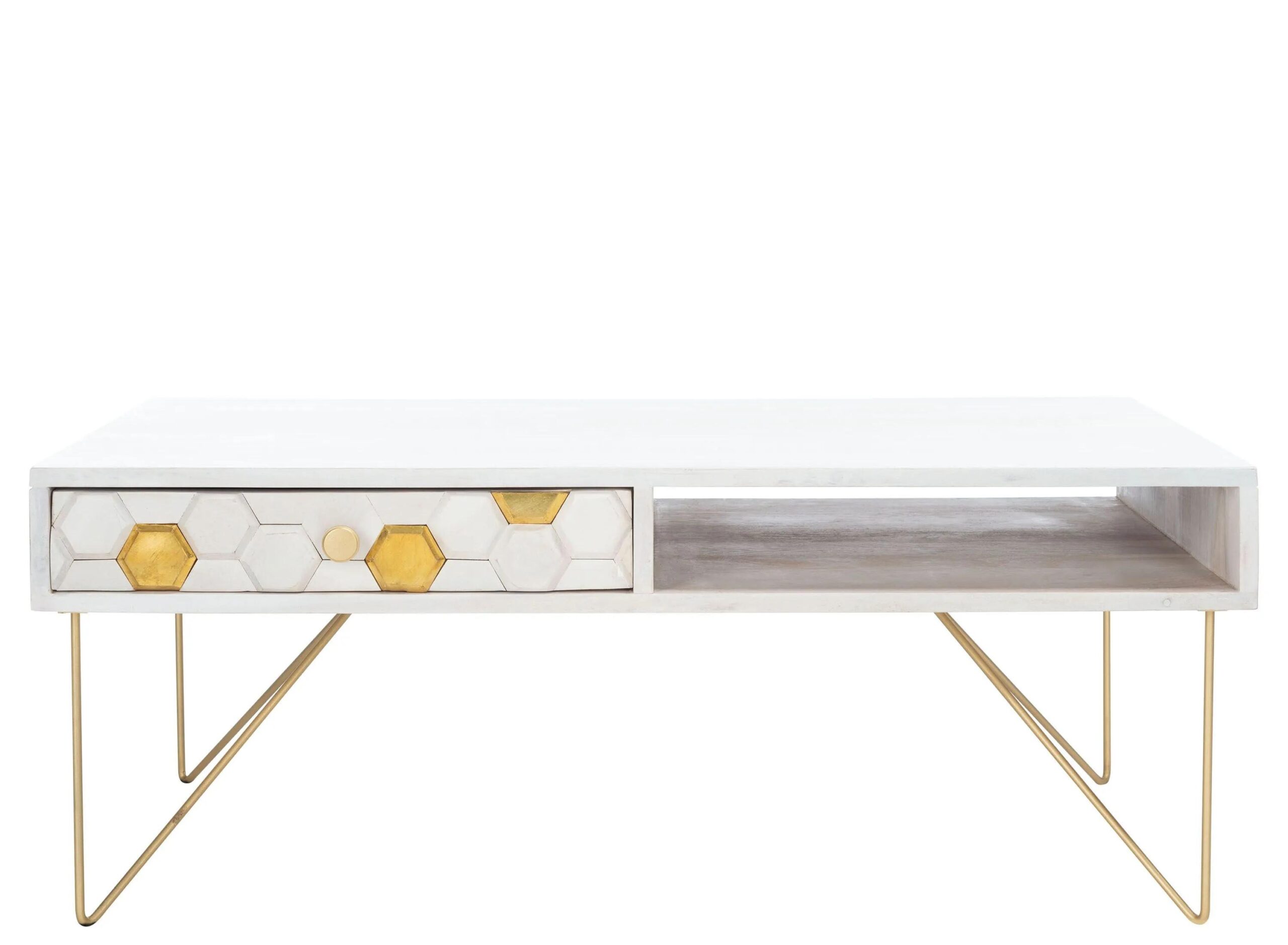 This stunning Arthur Coffee Table makes a bold style statement with its luxurious carved honeycomb design. Carefully crafted, its captivating pattern adds a dramatic flair to its whitewash finish. Oversized brass hairpin legs add retro charm.