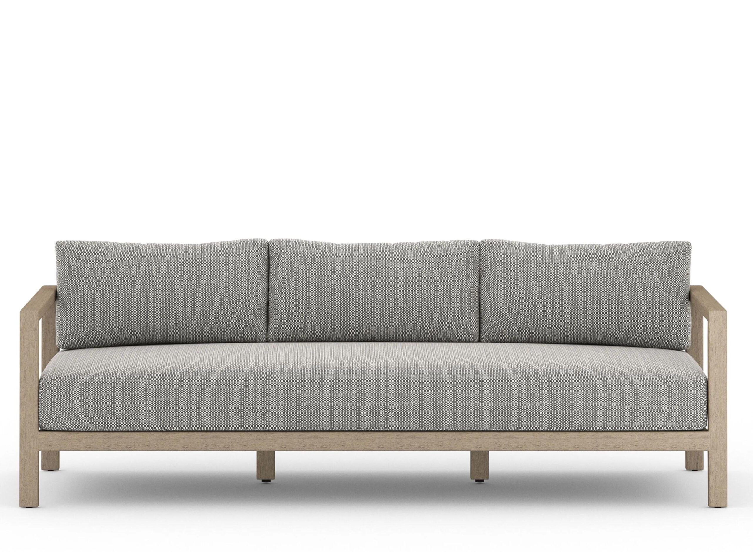 Modern materials ready a stylish silhouette for the outdoors with the Auberon outdoor sofa. Weathered grey teak forms a clean three-seat frame for UV-resistant and water-repellent Sunproof fabric in a textural ash.