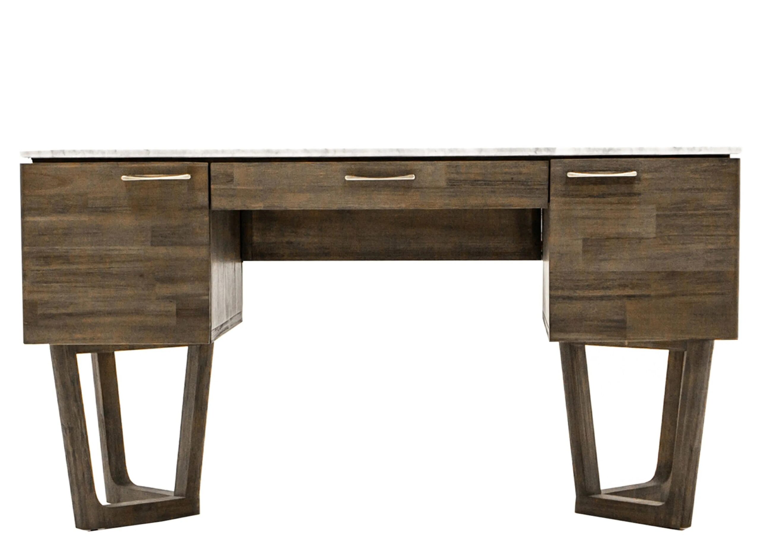 This Aura writing desk is mid-century modern by design, but not at all limited to any one style. Each piece boasts an Italian carrara marble top, solid acacia frame, and unique outward V shaped base.