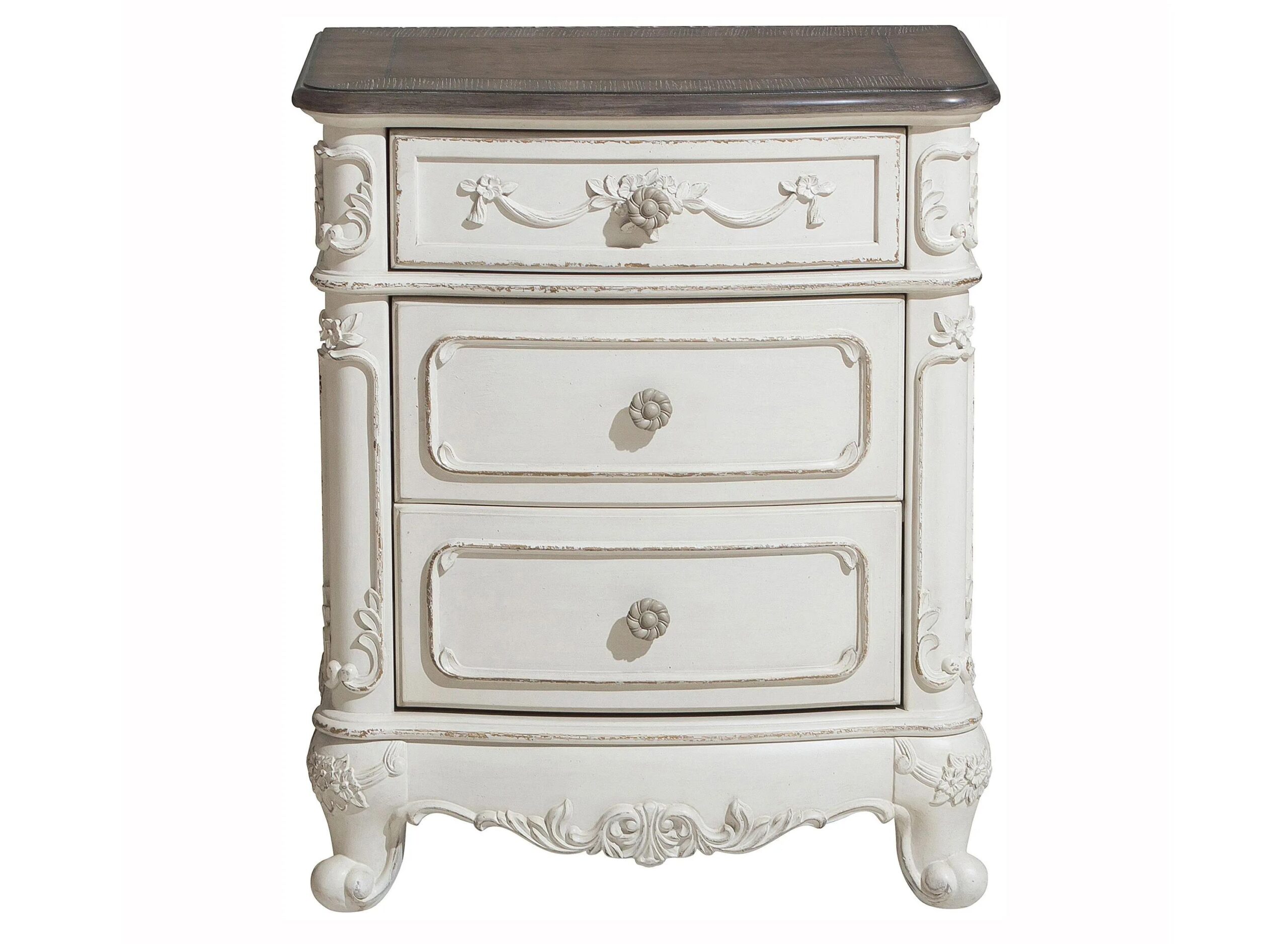 The Averny nightstand is your little child’s dream come true. The Victorian styling incorporates floral motif hardware and traditional carving details on the white with grey rub-through finished nightstand that will create the feeling of stepping into a fairy tale.