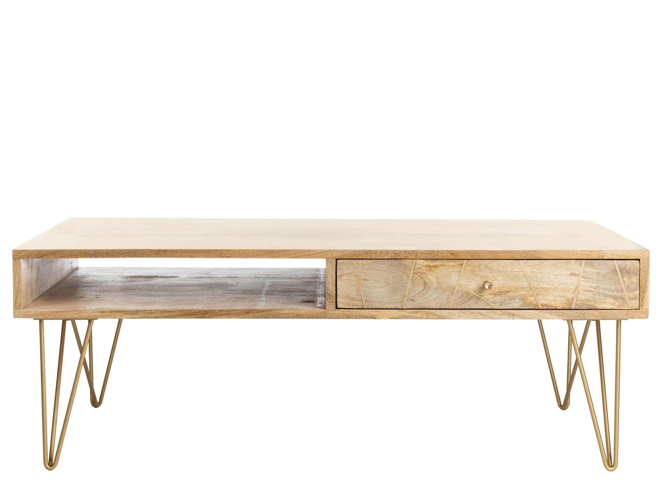 This Aviator Coffee Table brings decorative drama to any room with its retro inspired design and chic artisan details. Geometric hairpin legs in a sleek brass finish beautifully pair with the matching inlay on Aviator’s slim drawer, perfectly offsetting its smooth natural mango wood and ope