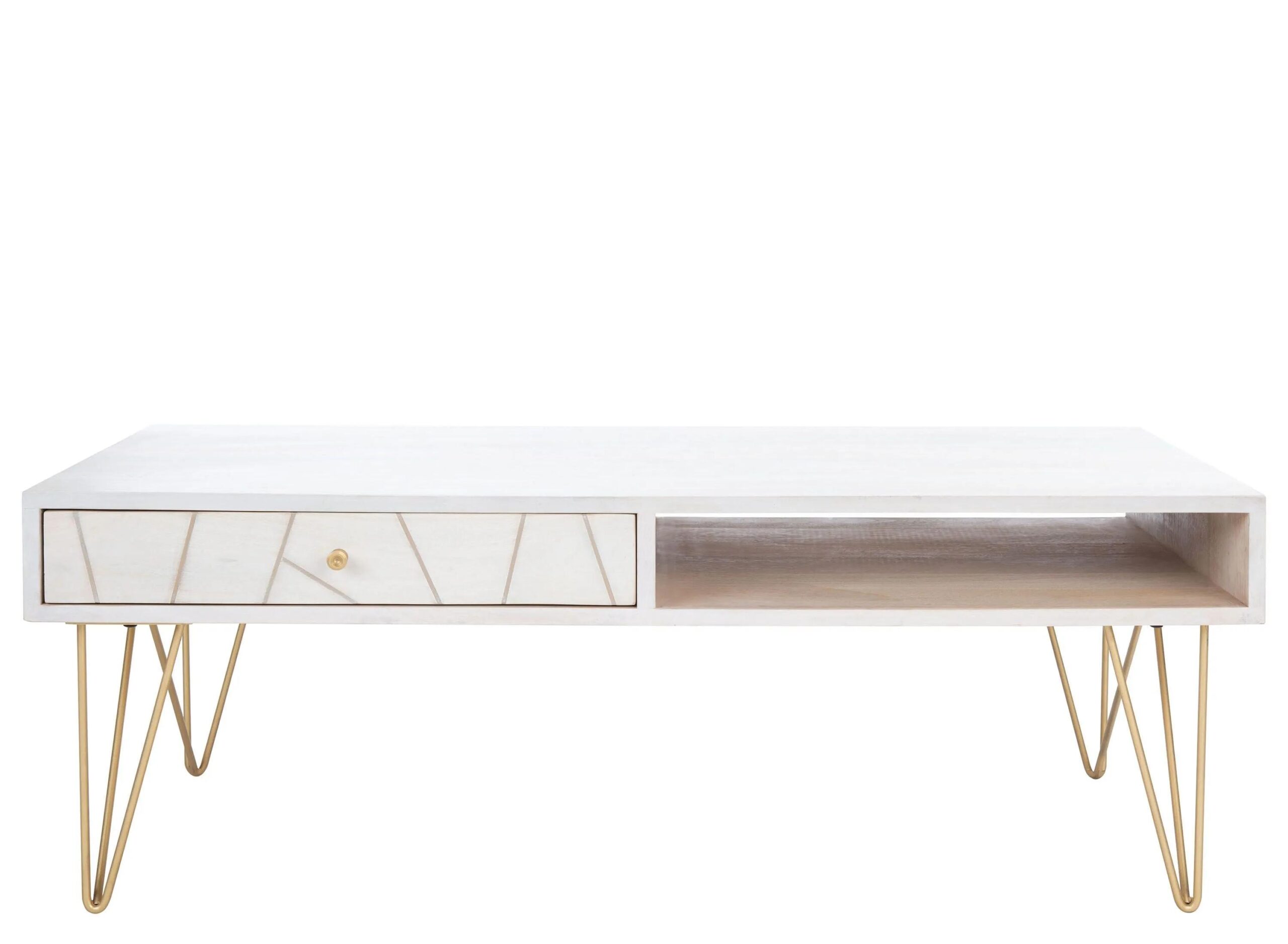 This Aviator Coffee Table brings decorative drama to any room with its retro inspired design and chic artisan details. Geometric hairpin legs in a sleek brass finish beautifully pair with the matching inlay on Aviator’s slim drawer, perfectly offsetting its smooth whitewash wood and open mi