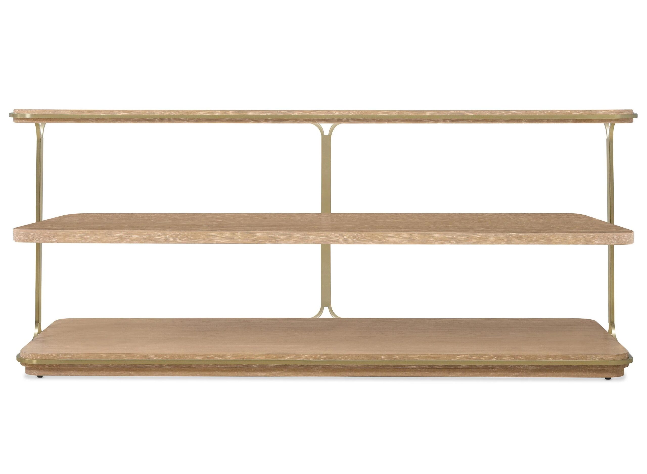 The Banyon Bay Console Table is designed for both function and style. Featuring white oak solids, oak veneers, and metal, this piece is finished in a light Desert Oak with wire-brushing and cerusing for enhanced texture.
