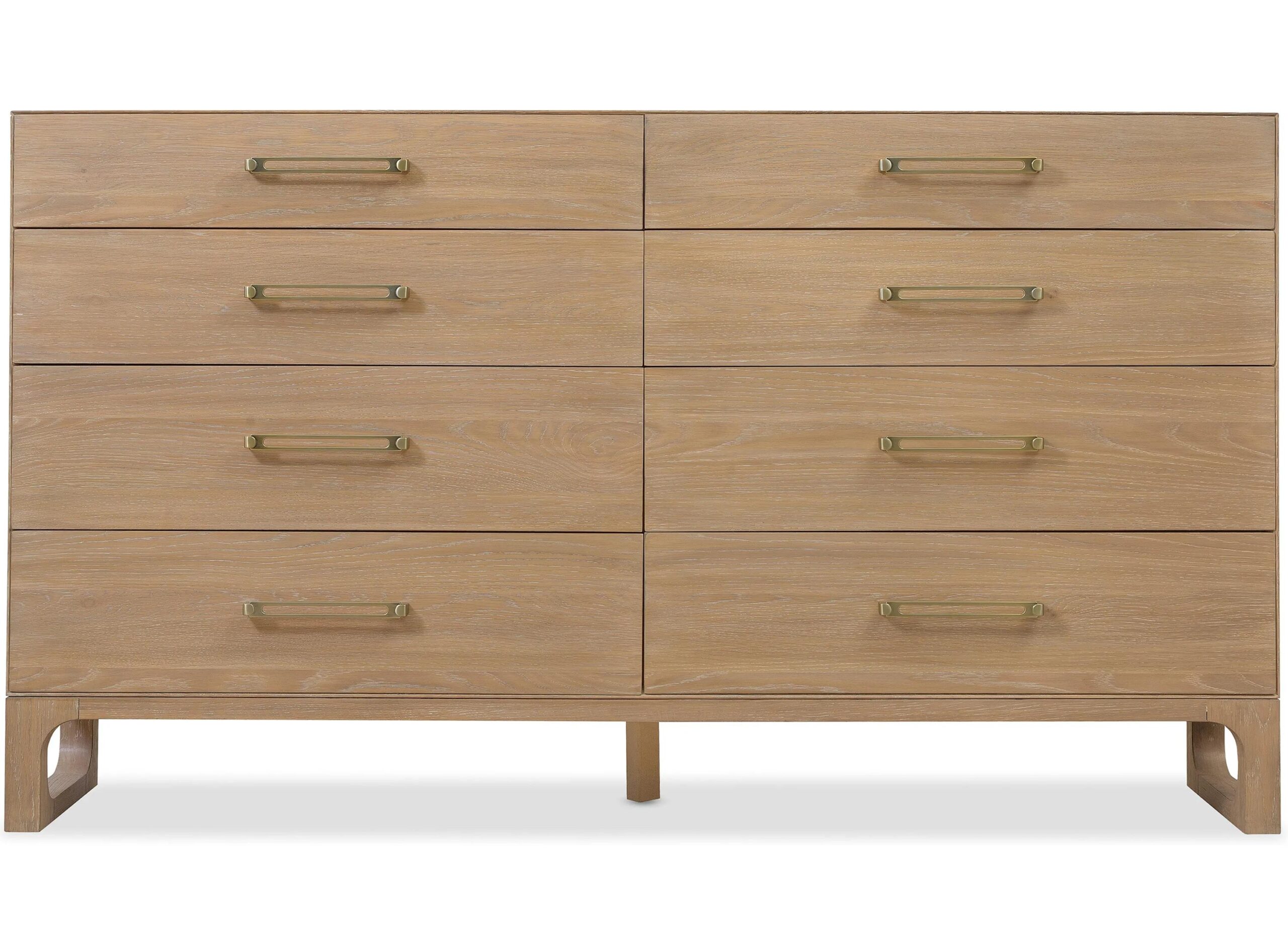 The Banyon Bay Eight Drawer Dresser offers ample storage and modern design. Made from white oak solids and oak veneers, it is finished in a light Desert Oak with wire-brushing and cerusing for added texture.