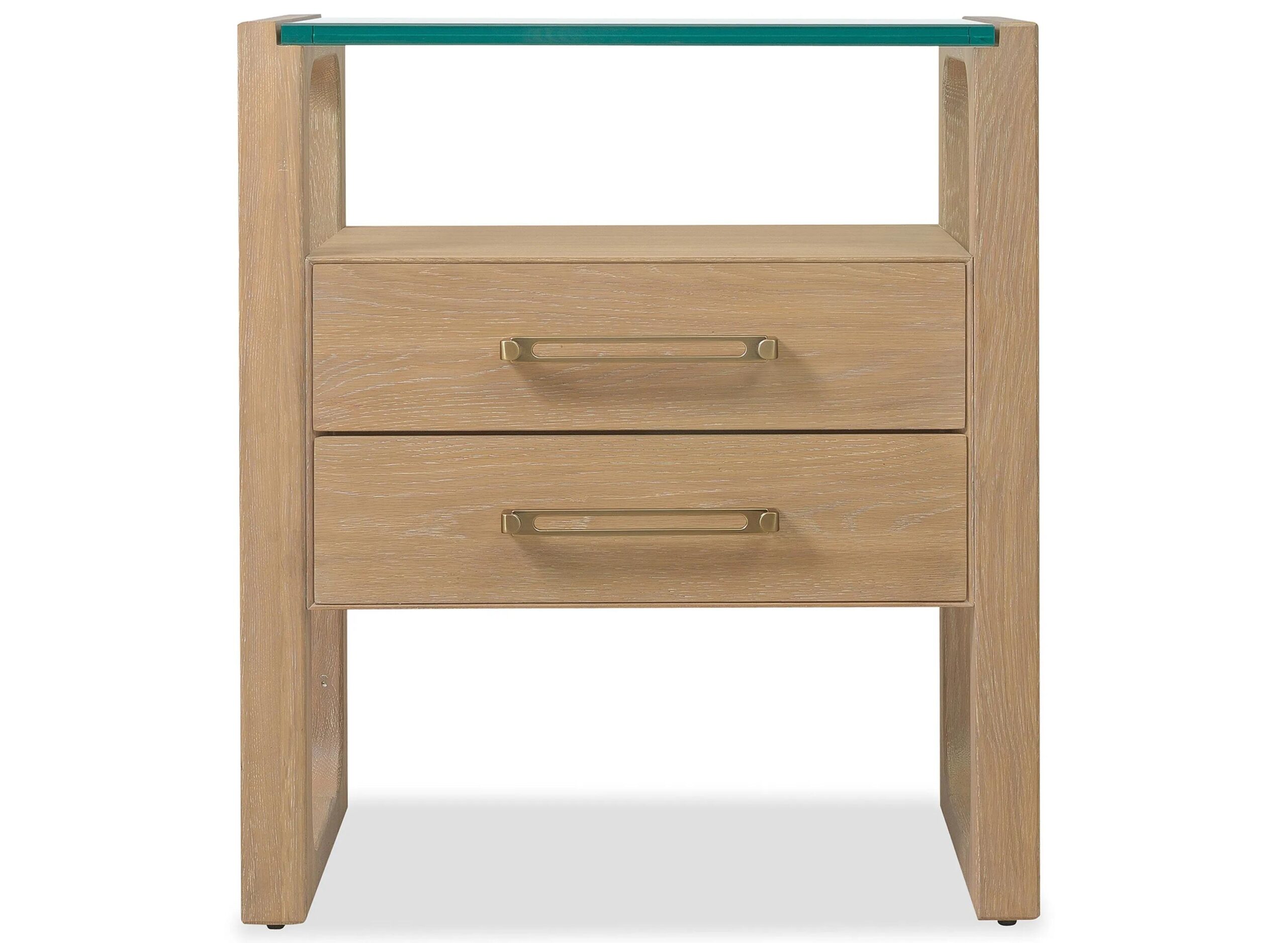 The Banyon Bay Two Drawer Nightstand offers a balance of function and design. With its light Desert Oak finish, this nightstand features white oak solids and oak veneers with tempered glass. The multi-step finish includes wire-brushing and cerusing for added texture, while stainless steel custom