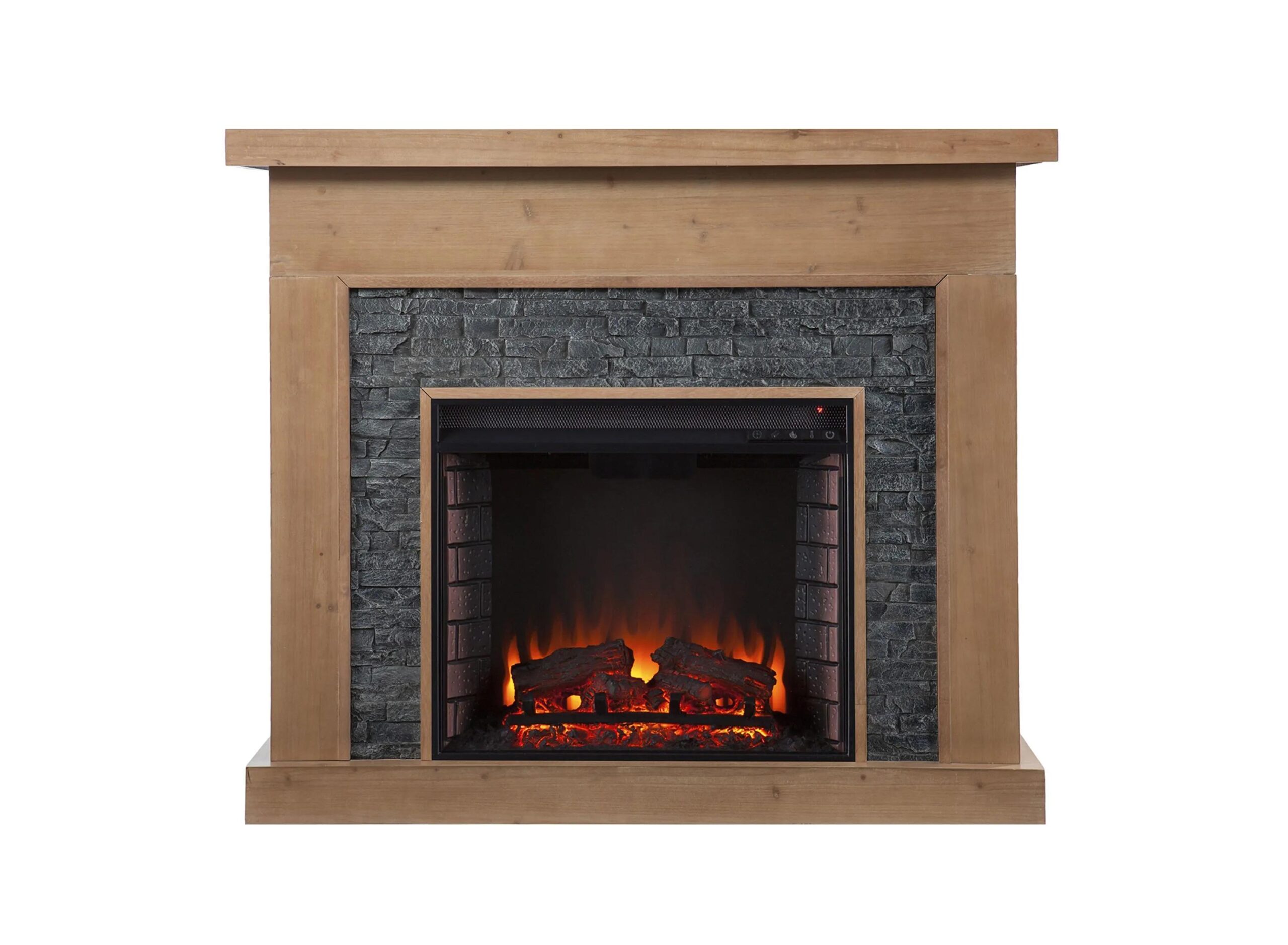 Warm up your farmhouse style with the Barbe Electric Fireplace. Natural wood finish crafts a sleek, modern look, while the gray faux stone adds an organic feel to your living room or den. Remote-controlled features and flickering LED flames give your entertaining space a cozy feel, working with o