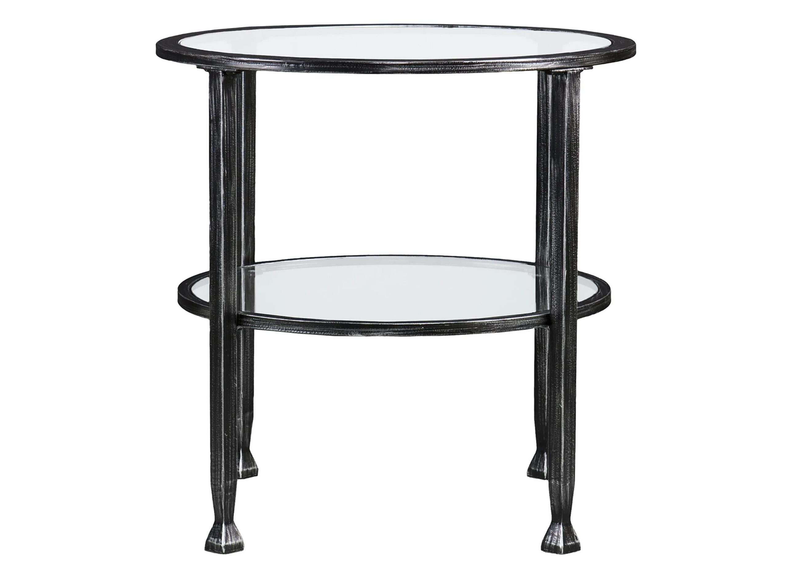 Circle gets the square with this Bexley Metal/Glass Round End Table. Distressed black metal cradles tempered glass tabletop and shelf into open architecture, ready to display your top ten reading list or favorite mementos.