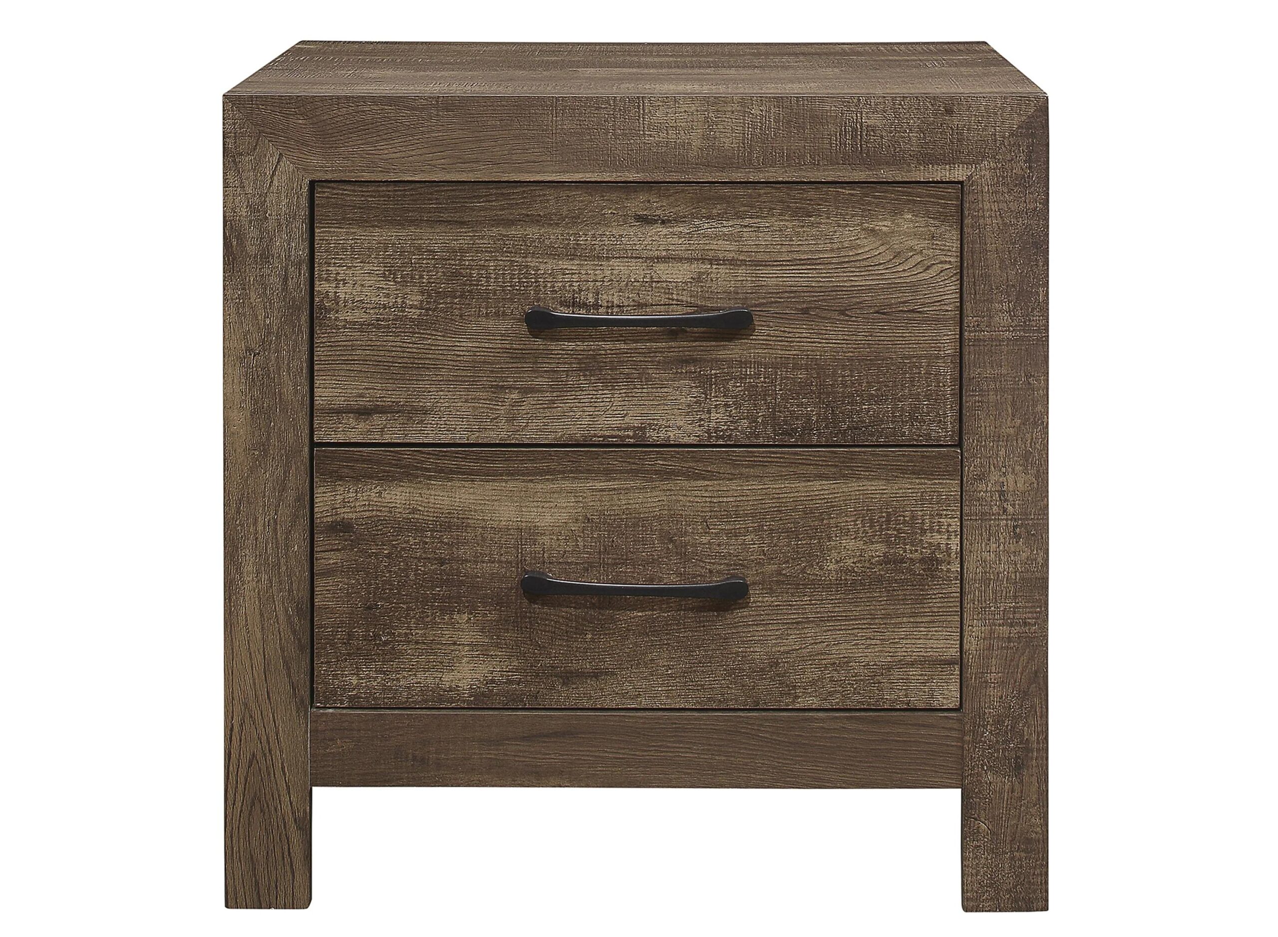 Modern lines and rustic styling are paired to create the look of the Bijou Nightstand. The embossed faux-wood veneer’s texture is highlighted by a rustic finish for a realistic wood look. Providing complementing contrast, the drawer fronts of the nightstand feature black metal hardware.