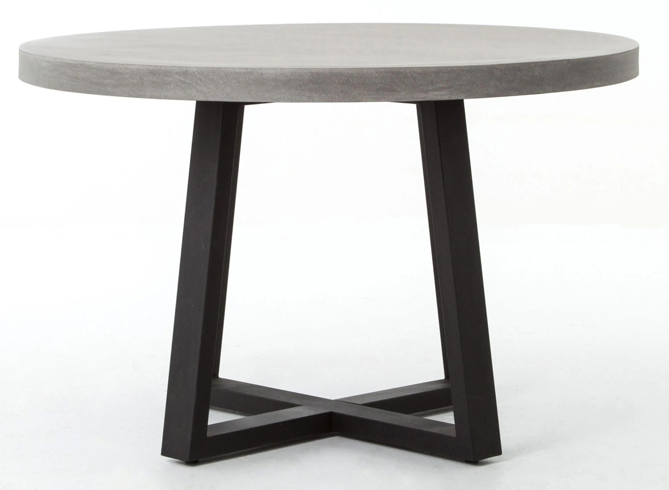 A strikingly simple poly-resin top derived from river sand is polished to a smooth sheen. An angled, matte black iron base adds architectural appeal with this Blithe round outdoor dining table. Slight color variance is to be expected, and speaks to lava stone’s organic nature.