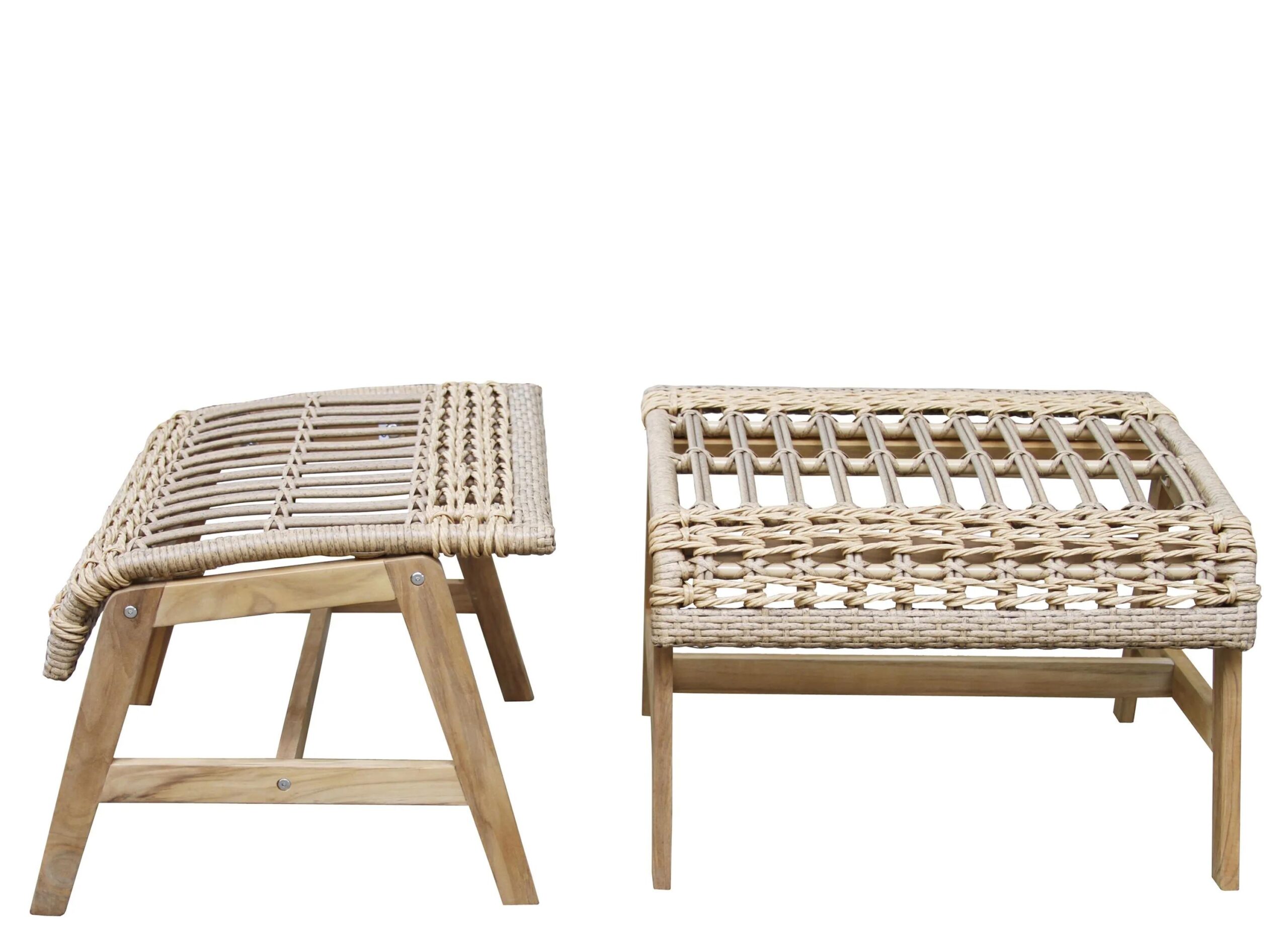 Kick your feet up as you unwind under the sun with this weather-resistant outdoor Bohemian Teak and Wicker Ottoman. Crafted from solid teak wood, its low-profile base features four flared legs and an angled top in a natural stain for a warm touch.