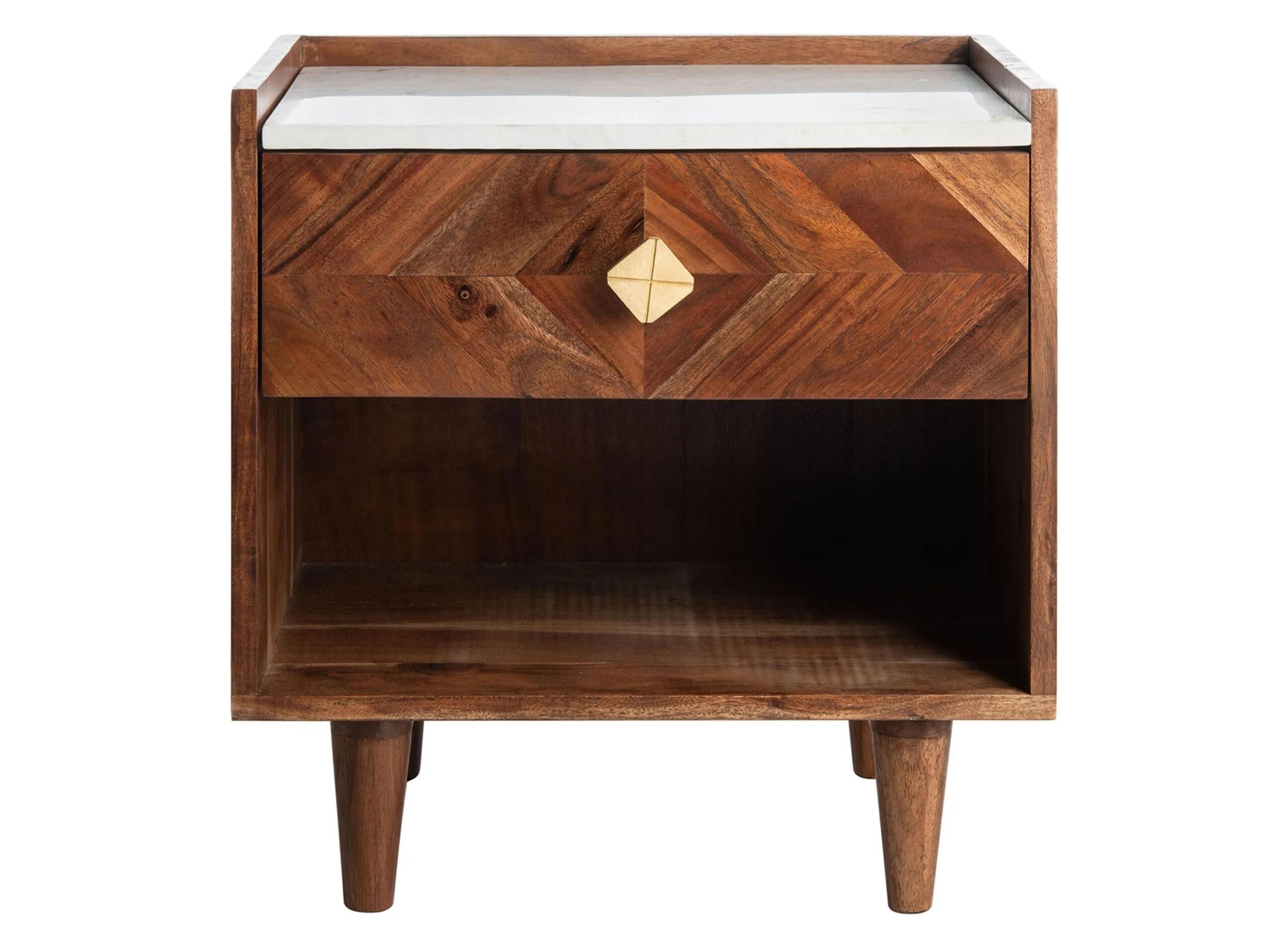 Bring striking visual intrigue to any bedroom with this Bora Parquet Nightstand. Finely crafted of acacia wood in a rich walnut finish that highlights the geometric design on its single drawer, Bora features a faux white marble top that beautifully offsets its deep colors and gold hardware.