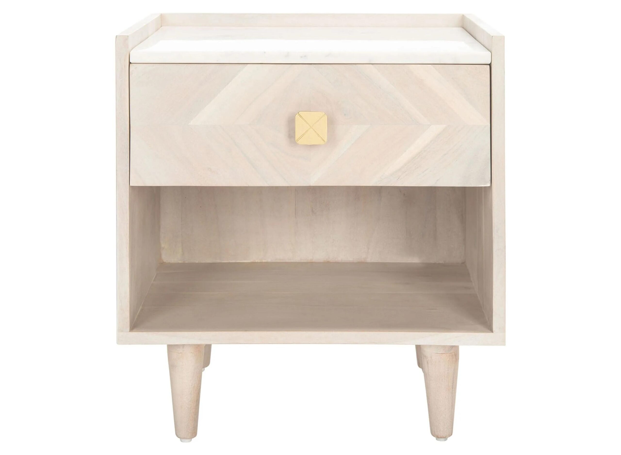 Bring striking visual intrigue to any bedroom with this Bora Parquet Nightstand. Finely crafted of acacia wood in a whitewash finish that highlights the geometric design on its single drawer, Bora features a faux white marble top that beautifully complements its soft colors and brass hardware.