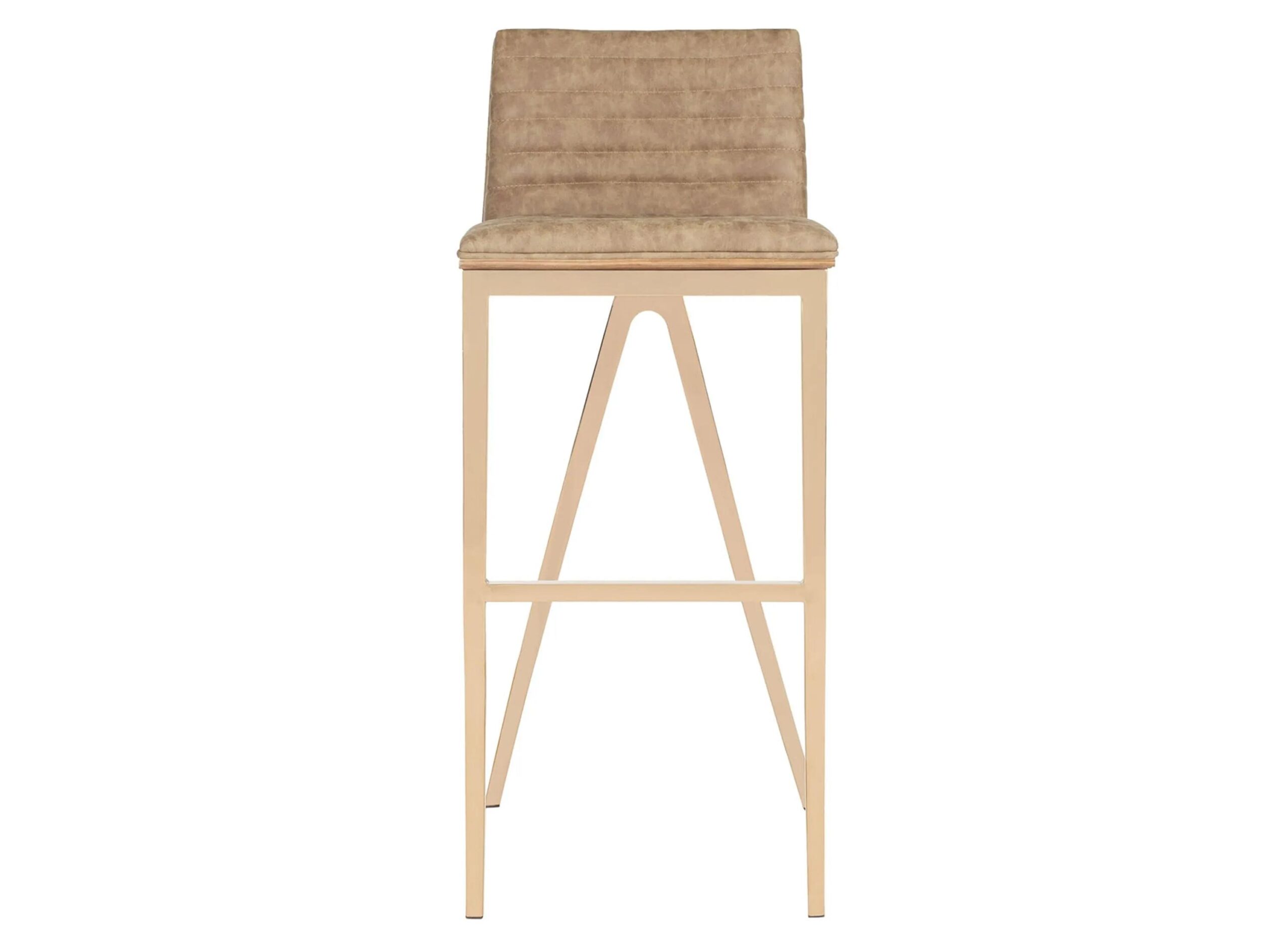 Elevate the art of imbibing with this retro style Boris bar stool. Its brown faux leather upholstery with gently tufted curves is paired with deluxe copper finished legs to make it the best seat in the house.