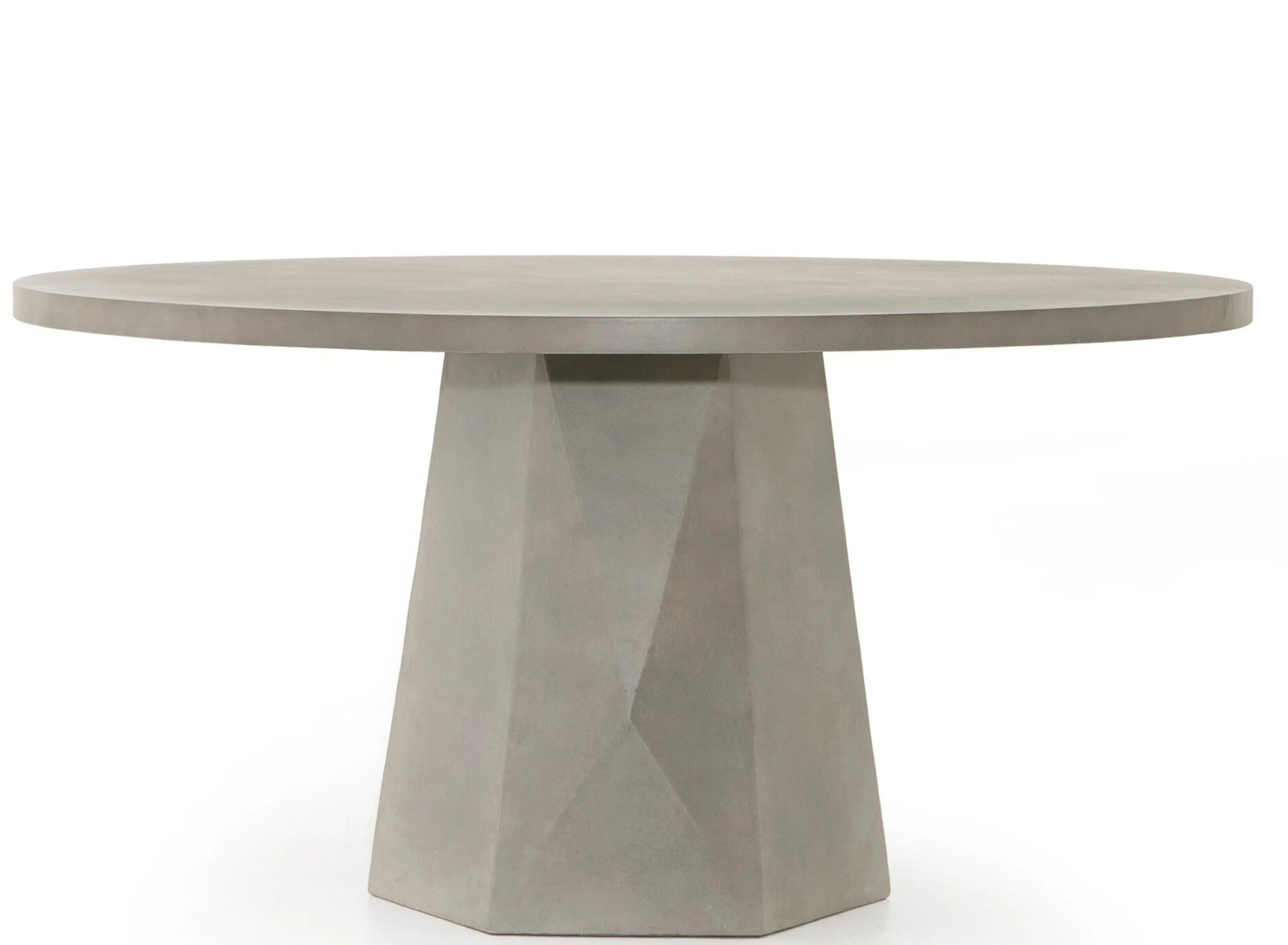 The Bowman Outdoor Dining Table in Gray-finished concrete, forms a faceted base for impact from every angle. A roomy, rounded top is ready to welcome guests indoors or out. Cover or store inside during inclement weather and when not in use.