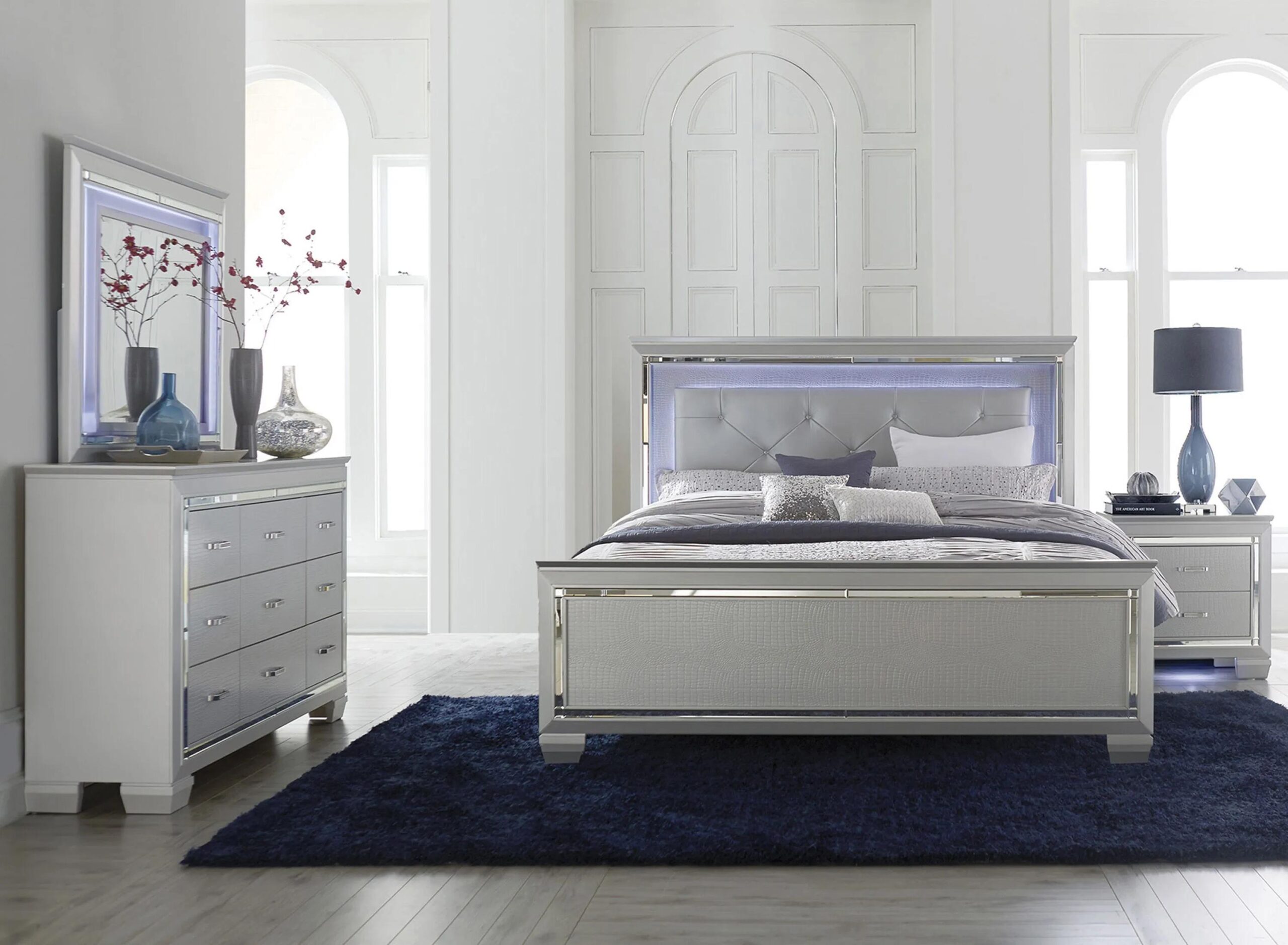 Glamour reigns in the design of the Brambley Bedroom Set. Framing the bed is a decorative beveled mirror accent that enhances the illumination from the touch-engaged LED backlight of the headboard and mirror, as well as the under-light of the night stand.