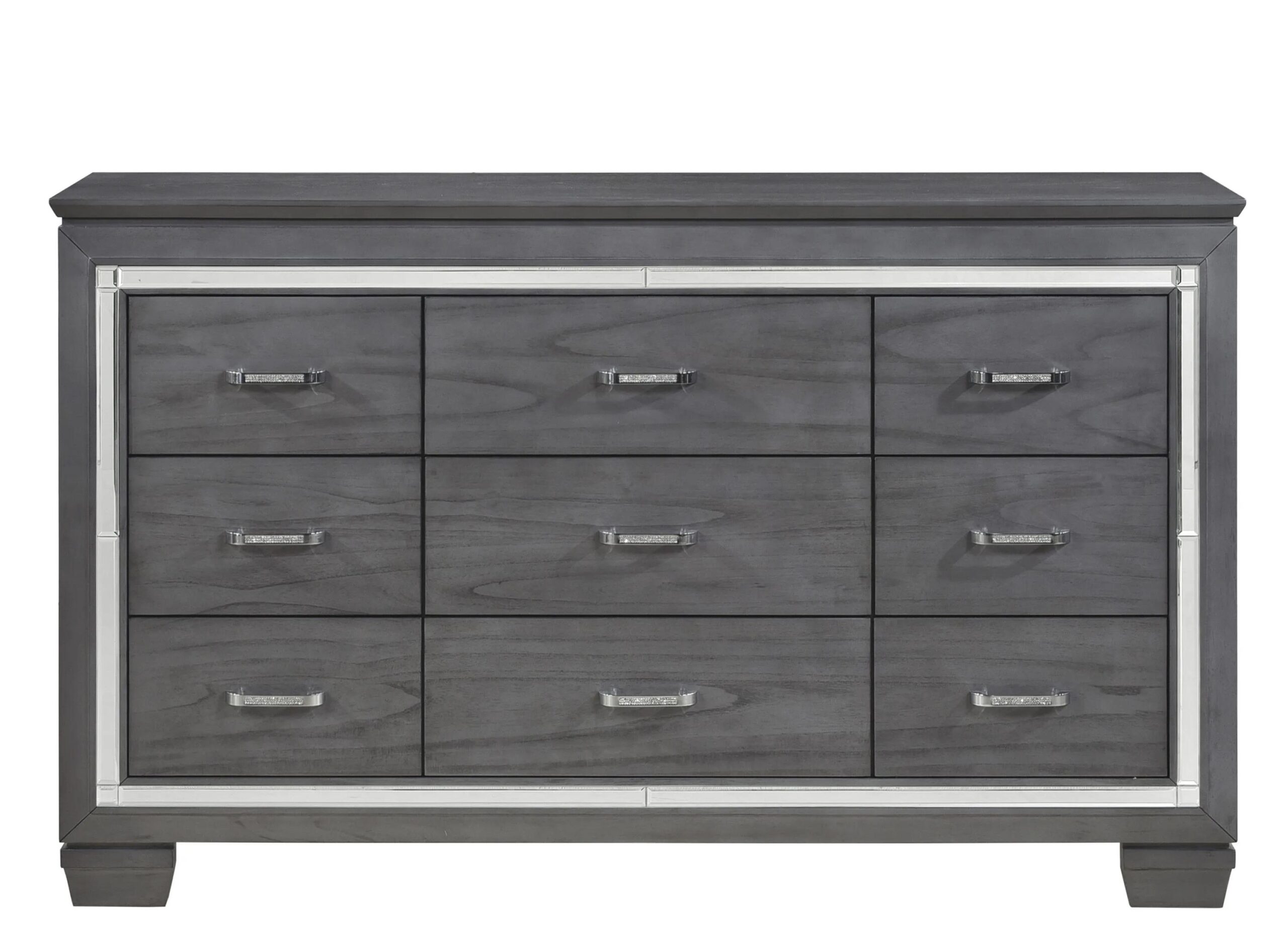 Glamour reigns in the design of the Brambley bedroom dresser. Framed by a decorative beveled mirror accent that enhances illumination. Alligator embossing and high polished crystal elevates hardware boldly accent the finish – over mindy veneer – of the collection, providing additional