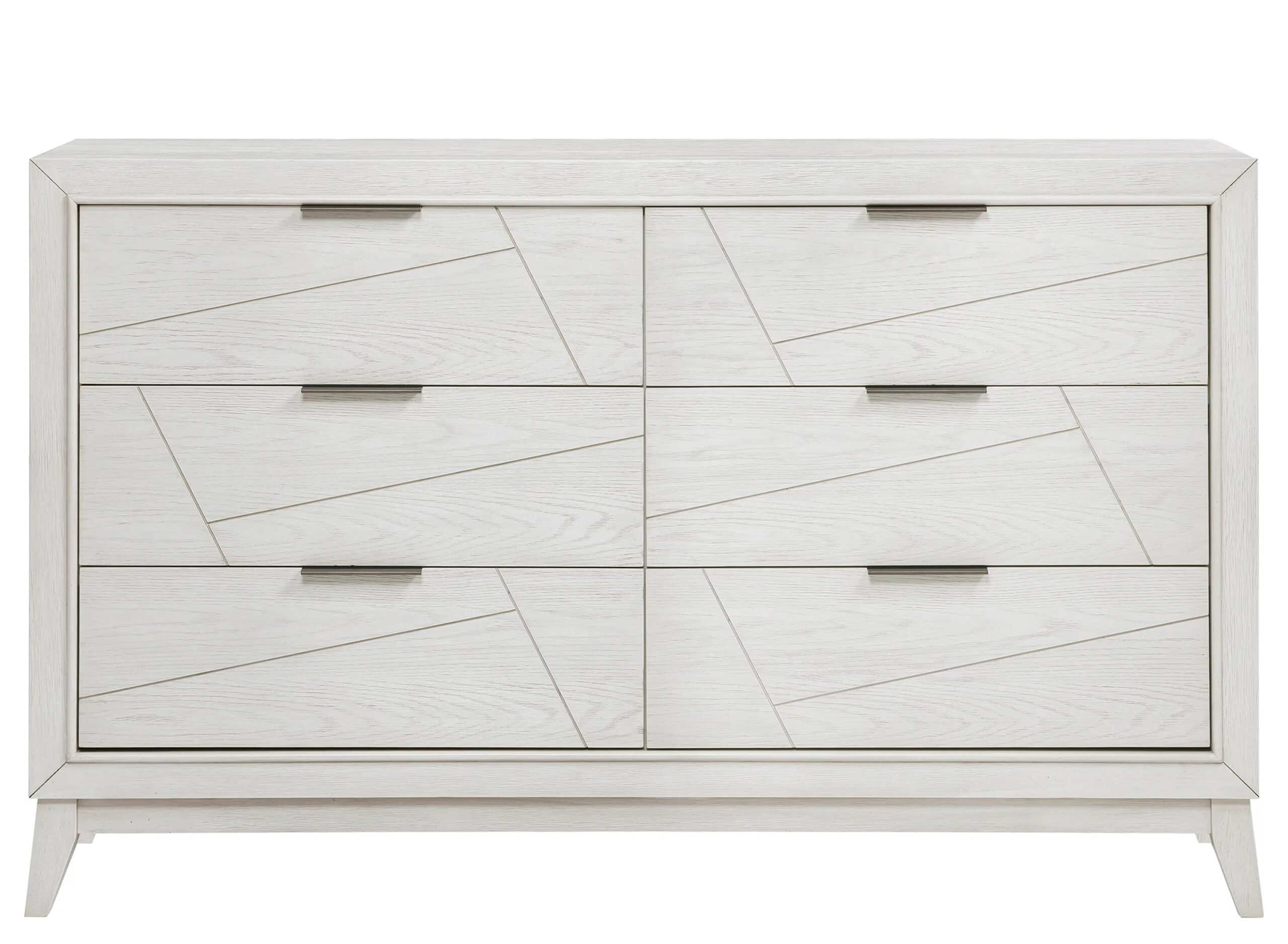 Bold geometrical styling is paired with unfettered modern lines to create the unique design of the Brickell Dreser. An antique white finish highlights the collection’s oak veneer. Flat black finished metal bar hardware fronts the drawers of the dresser.