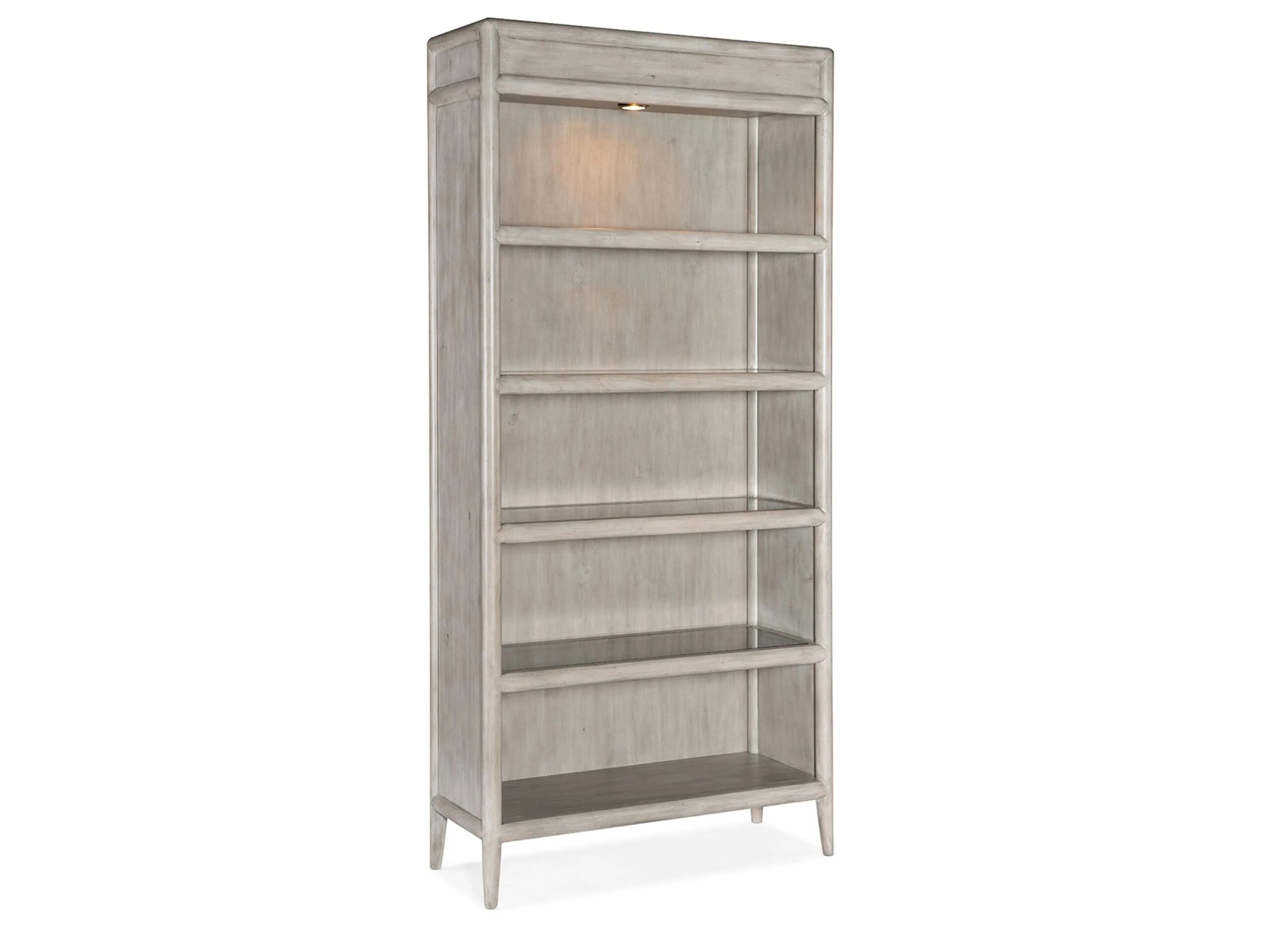 With a soft modern and casual appeal, the Burnham Bookcase is crafted of Alder Veneers with knots in a Grey Mink finish accentuated by a tactile veneer pattern on the back panel and slender tapered legs.