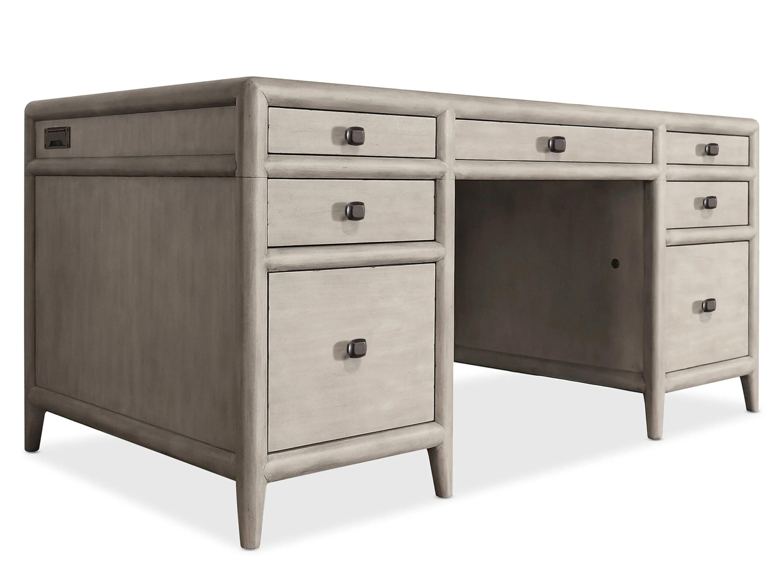 With a soft modern and casual appeal, the Burnham Junior Executive Desk is crafted of Alder Veneers with knots in a Grey Mink finish accented by dark bronze knob hardware. This functional and versatile piece features 7 drawers, and the top left and right drawers are on full extension metal ball b