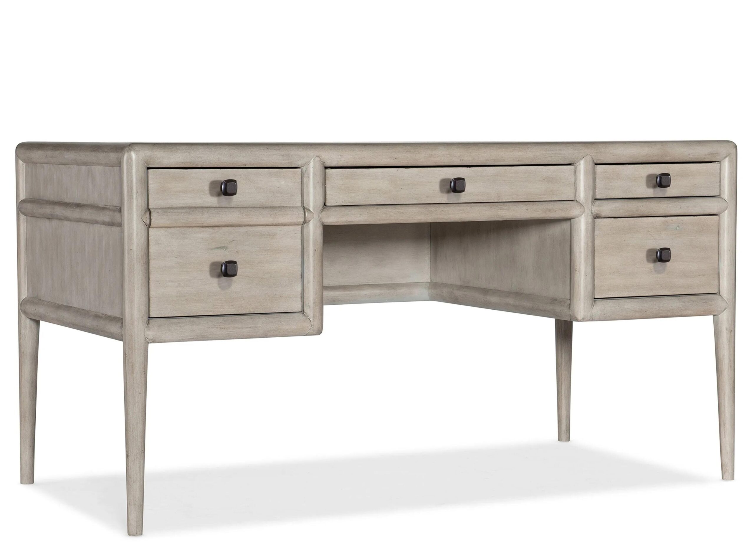 With a soft modern and casual appeal, the Burnham Writing Desk is crafted of Alder Veneers with knots in a Grey Mink finish with dark bronze knob hardware. Featuring 4 drawers, the left drawer is a file drawer with pendaflex system and full extension metal ball bearing slides.