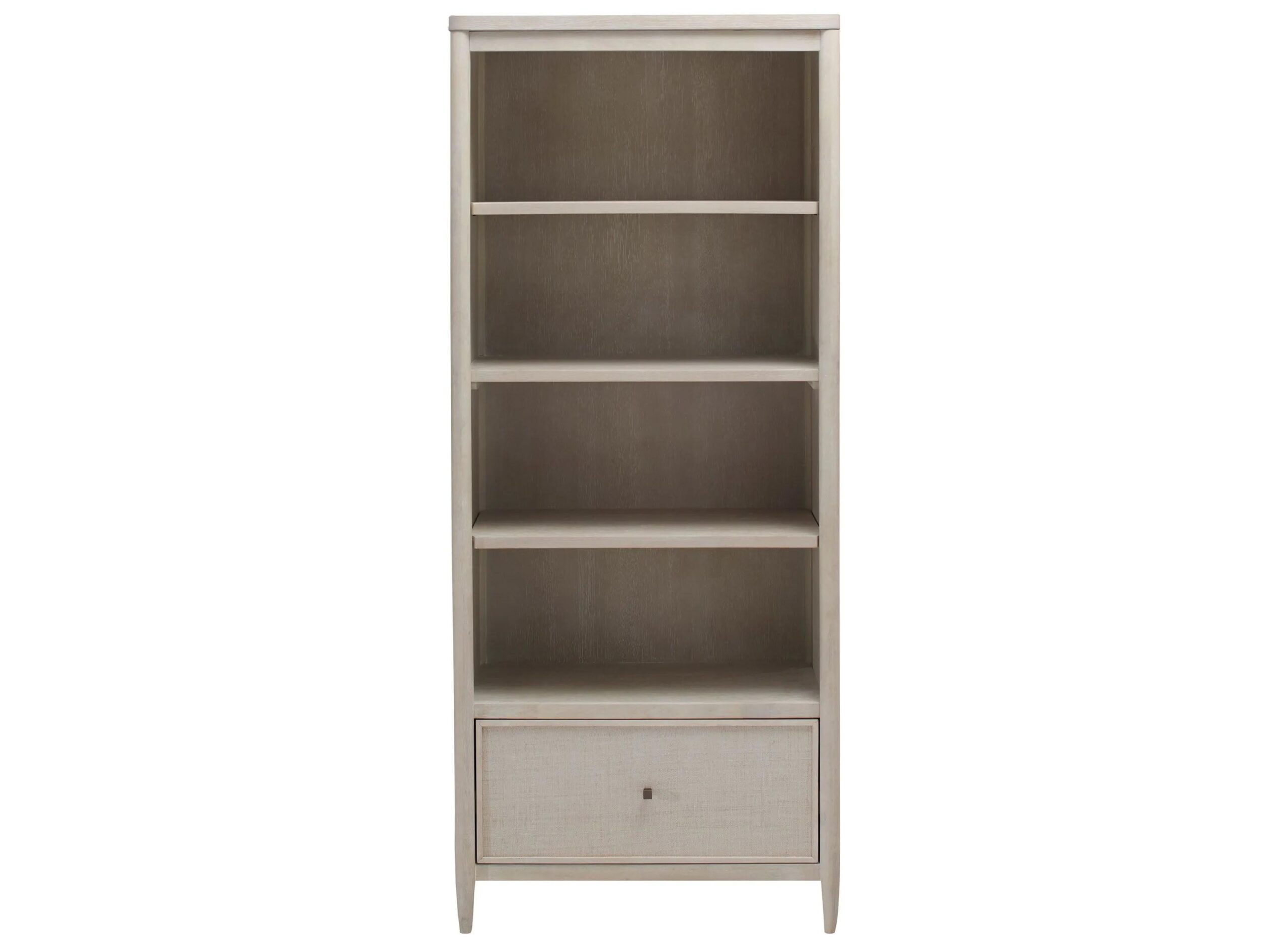 A modern twist on a coastal-inspired aesthetic, the Caspian collection features light sand finishes, sea grass accents, and rounded posts. The Caspian bookcase features four fixed shelves and a lower drawer for letter- and legal-size files.