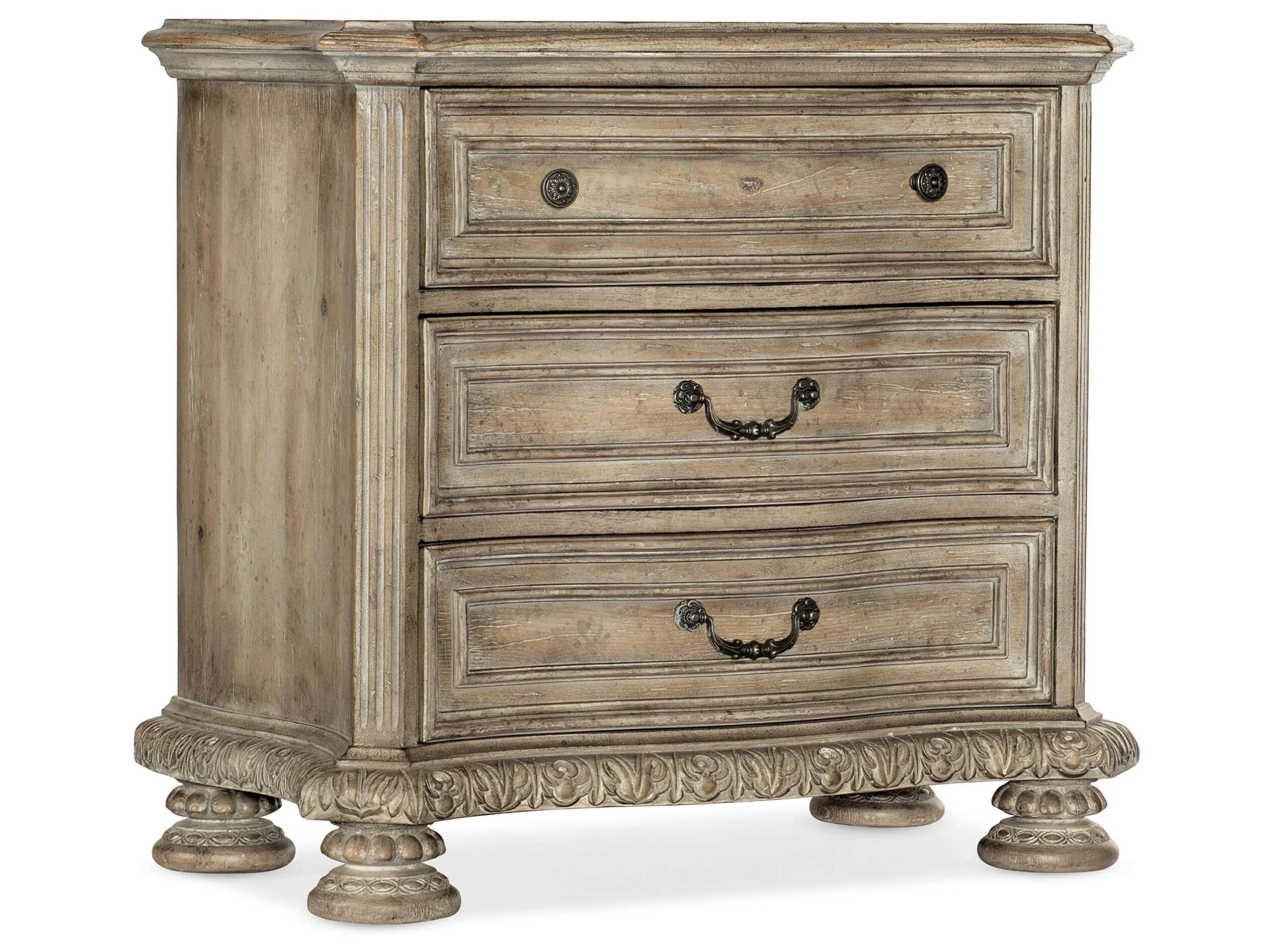Castella Three Drawer Nightstand brings together classic style elements and a refined rustic finish in an impassioned marriage of casual opulence. Exuberant design motifs such as an acanthus leaf molding around the base, column motifs on the edge of the case and ornate bun feet infuse the piece w