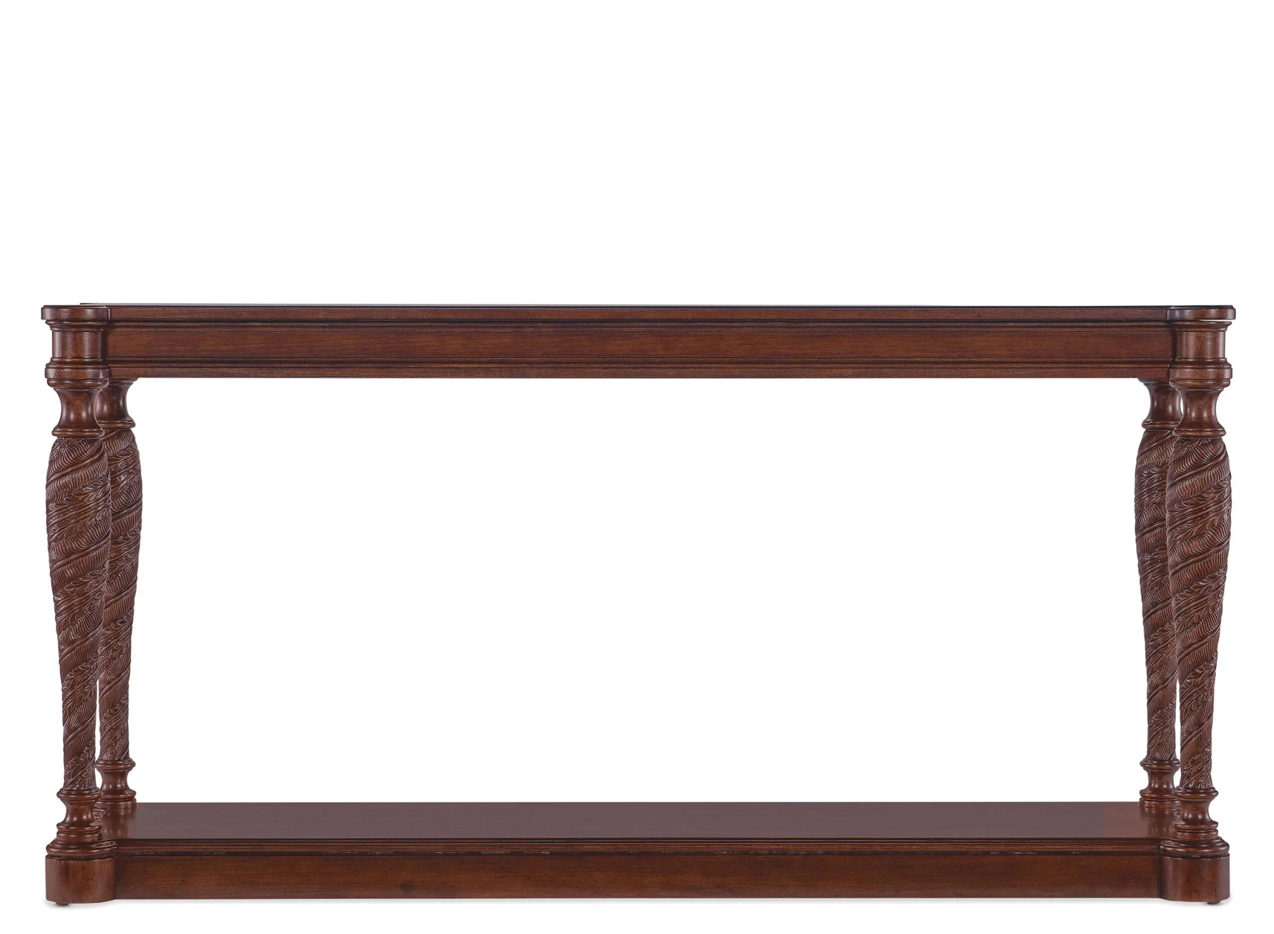 Inspired by the tropical craftsmanship of the West Indies and classic British and Dutch Colonial design periods, the Charleston Console Table has an intricate carved leaf motif on the shaped legs. With one fixed shelf, it is crafted of Cherry Veneers with a Solid-Wood Edge top and finished in the
