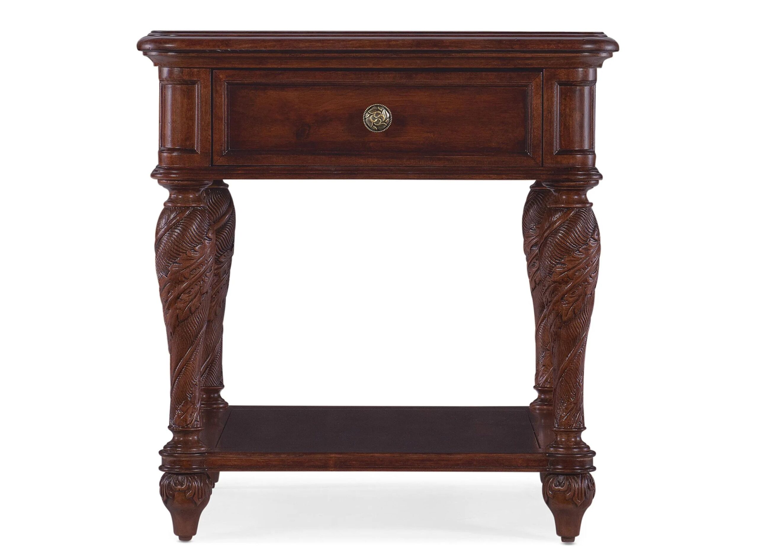 Inspired by the tropical craftsmanship of the West Indies and classic British and Dutch Colonial design periods, the Charleston End Table has an intricate carved leaf motif on the shaped legs. With one fixed shelf and one self-closing drawer, it is crafted of Cherry Veneers and Walnut Inlay with