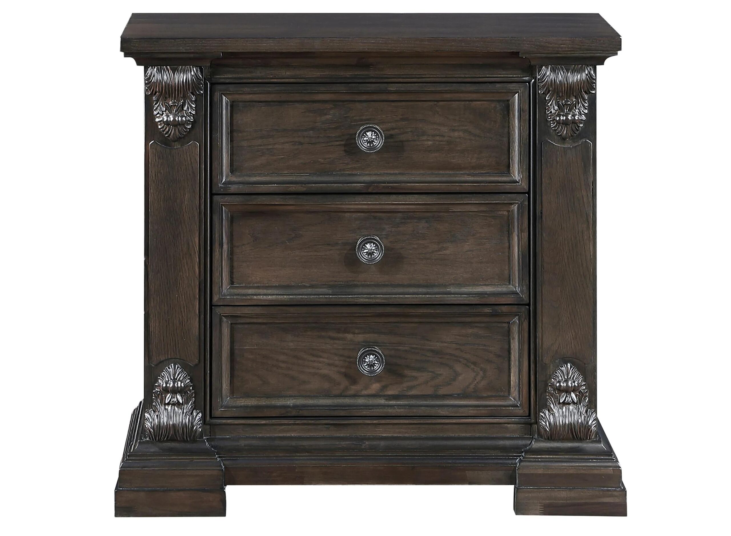The elegant stature of the Cheswold Nightstand is solidified in its prominent placement in your bedroom. The nightstand features corbel accented pilasters, and traditional framing. An espresso-hued finish complements the oak veneer of the piece while flat black knob hardware fronts the drawers of
