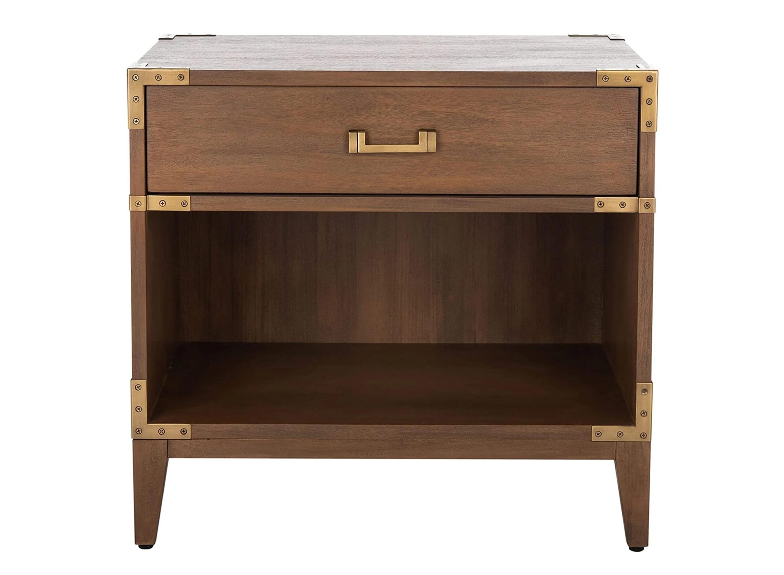 Industrial sass meets couture class in this stunning Christina Nightstand. Inspired by campaign style steamer trunks, Christina’s antiqued brass hardware and nailhead details give its brown mahogany frame a fashion-forward edge, while one drawer and an open bottom shelf provide ample bedsid