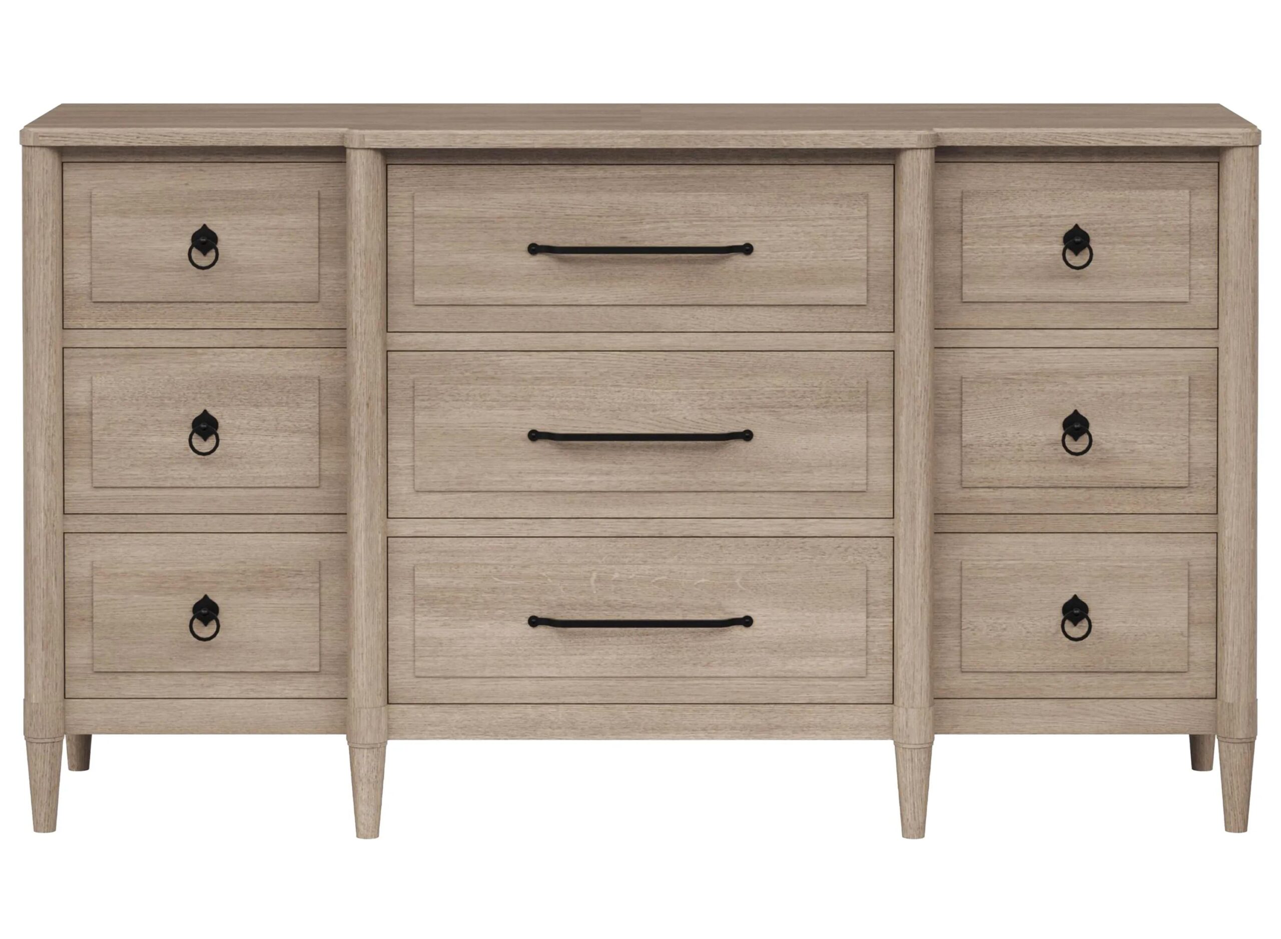 Enhance your bedroom with the Citrus Heights Breakfront Dresser, crafted from durable Mindi veneer for long-lasting quality and sophisticated appeal. This dresser features a unique breakfront design and nine spacious drawers with smooth-operating ball bearing guides for effortless functionality.