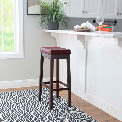 This red bar stool will add stylish seating to any counter or high top table in your home. The sturdy wood frame has a dark brown finish accented by a red faux leather seat. Antique brass nailhead trim and double needle accent stitching adds durability to the padded top for an eye catching detail