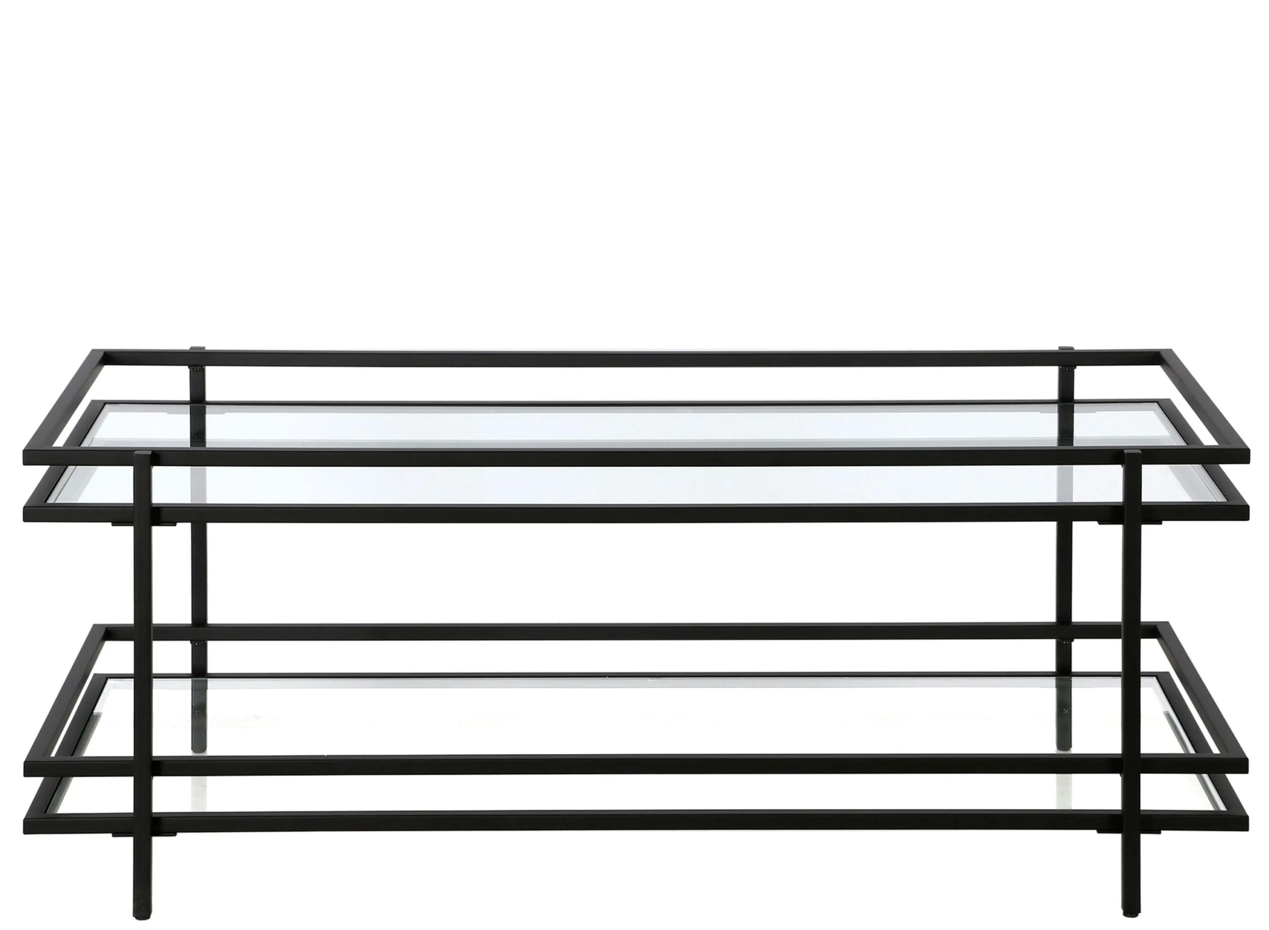 A bold linear profile sets this modern Clifton coffee table apart. Its double-barred steel frame offsets the durable tempered glass tabletop and shelf, creating a secure and artful backdrop for framed photos, flowers, or your favorite collections of decorative items.