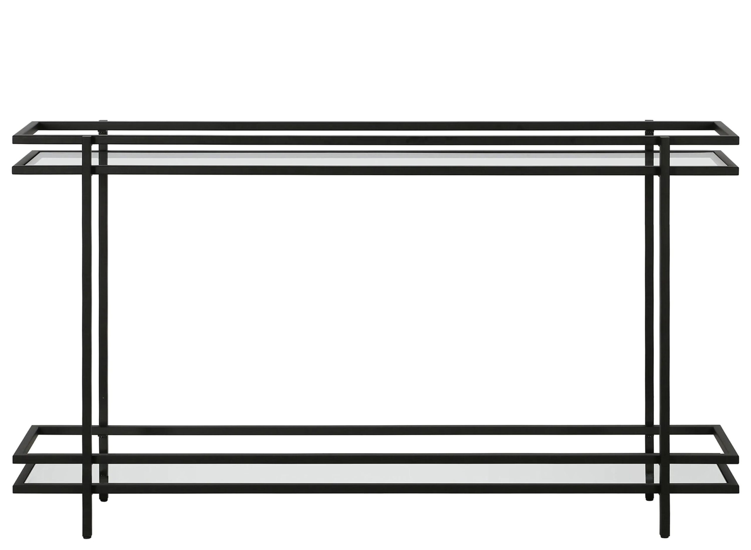 A bold linear profile sets this modern Clifton console table apart. Its double-barred steel frame offsets the durable tempered glass tabletop and shelf, creating a secure and artful backdrop for framed photos, flowers, or your favorite collections of decorative items.