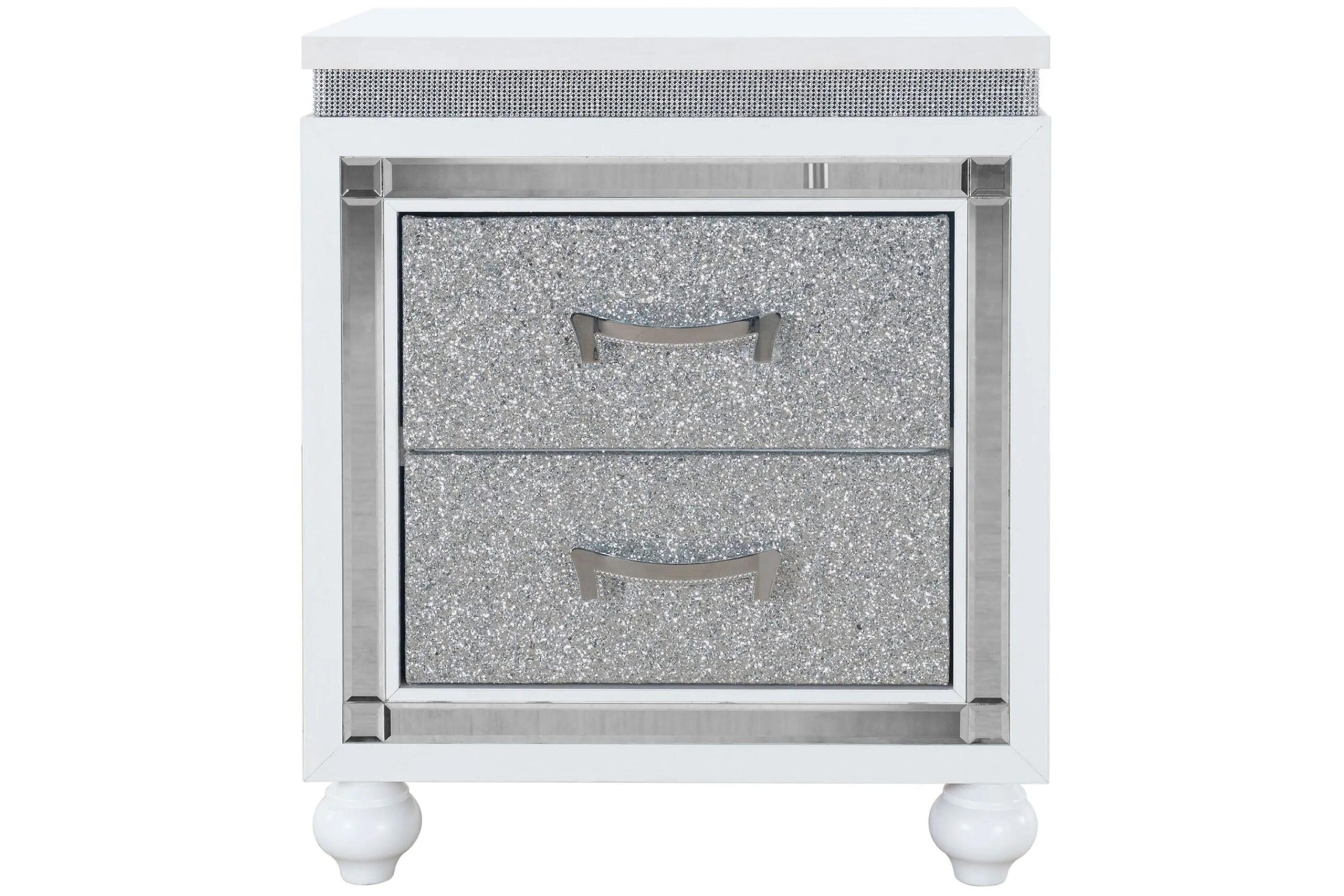 Introducing the Collete Nightstand, a luxurious piece that exudes modern glamour. Featuring crushed crystal drawer fronts and mirrored accents, this nightstand creates a dazzling atmosphere. The sleek hardware complements the design, while matching case pieces and the LED-lit bed (ALL SOLD SEPERA