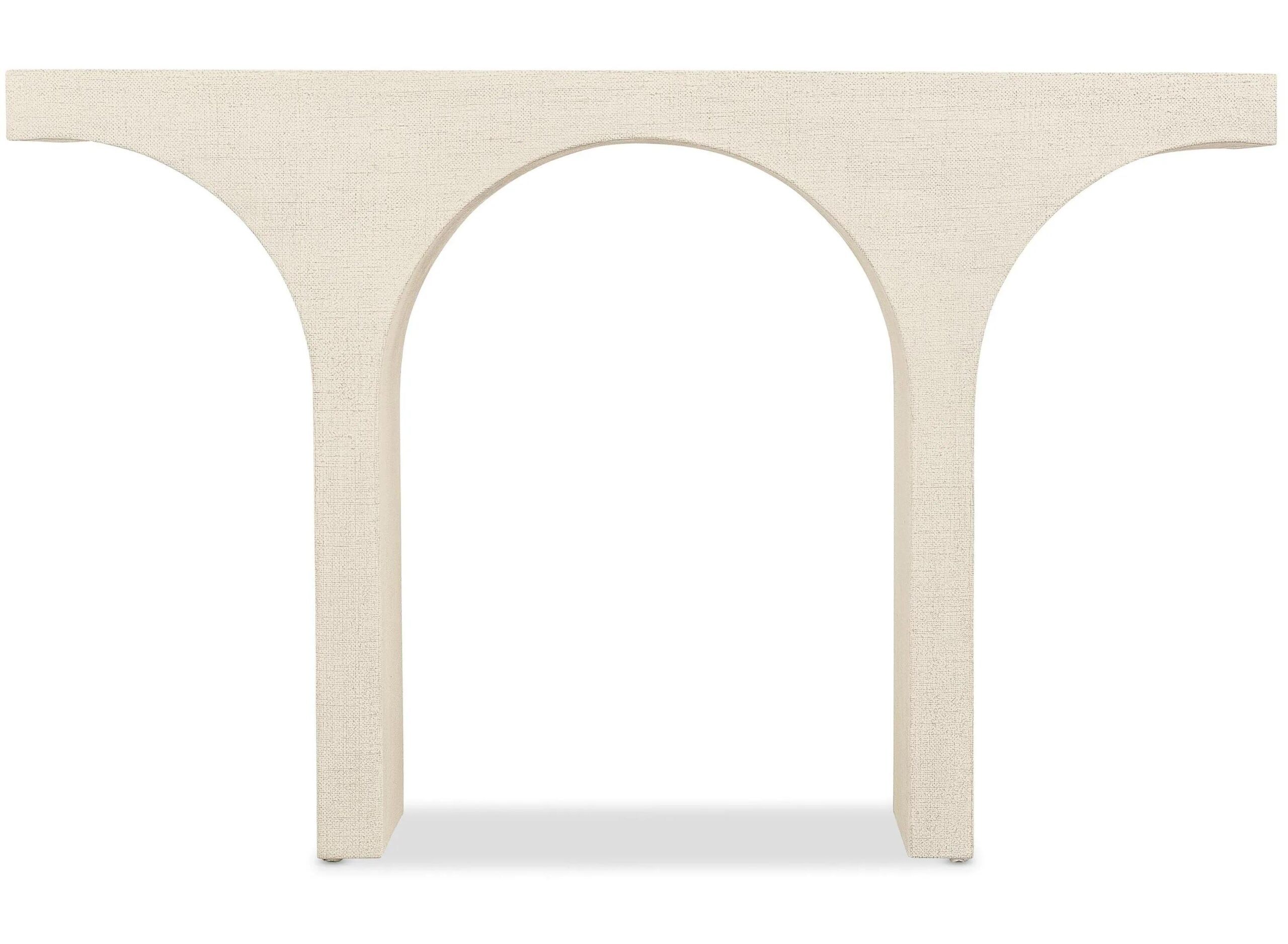 The Commerce and Market Console Table combines rustic charm with modern design. Crafted from wood and burlap, the table features a fully lacquered burlap-wrapped finish in a “Pebble Beach” lacquer.