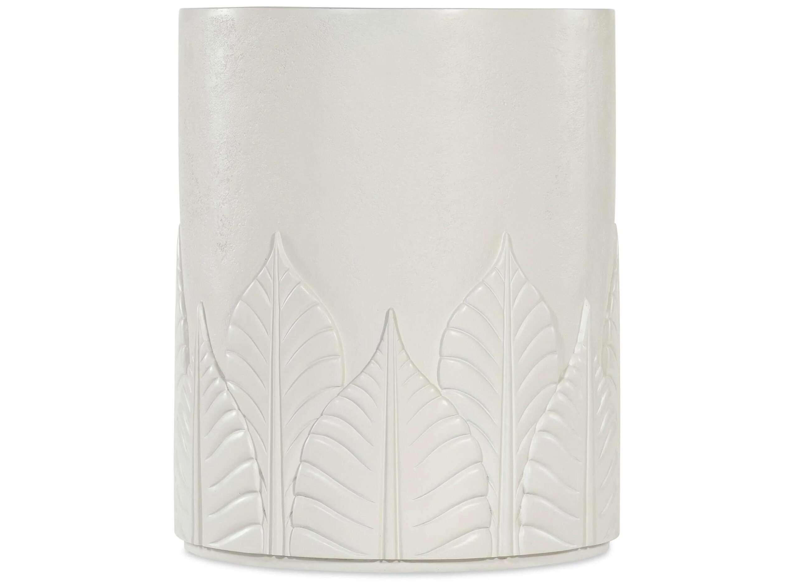 The Commerce and Market End Table mirrors the design of the cocktail table with its textured plaster-like finish and embossed leaf motif. Crafted from wood and resin, it features a round shape and durable construction.