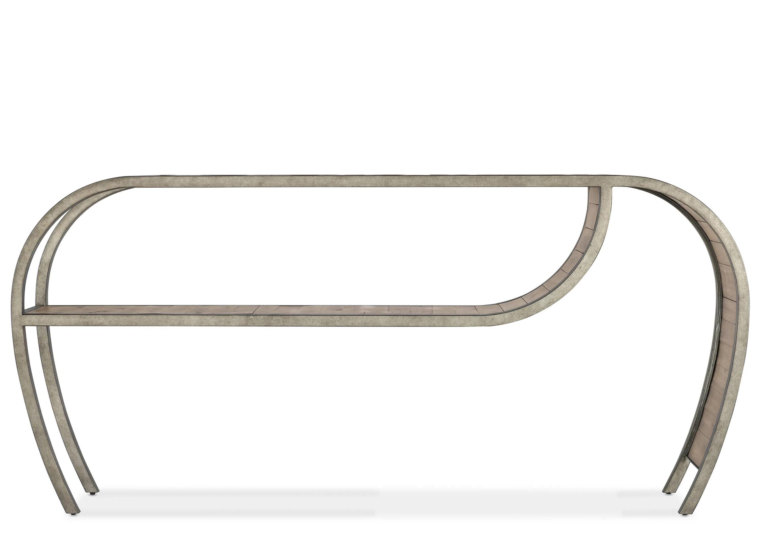 Commerce & Market Console Table combines a pewter metal frame with a planked-wood motif in a natural medium wood finish with distressing and visible knots. The curved design has one fixed shelf.